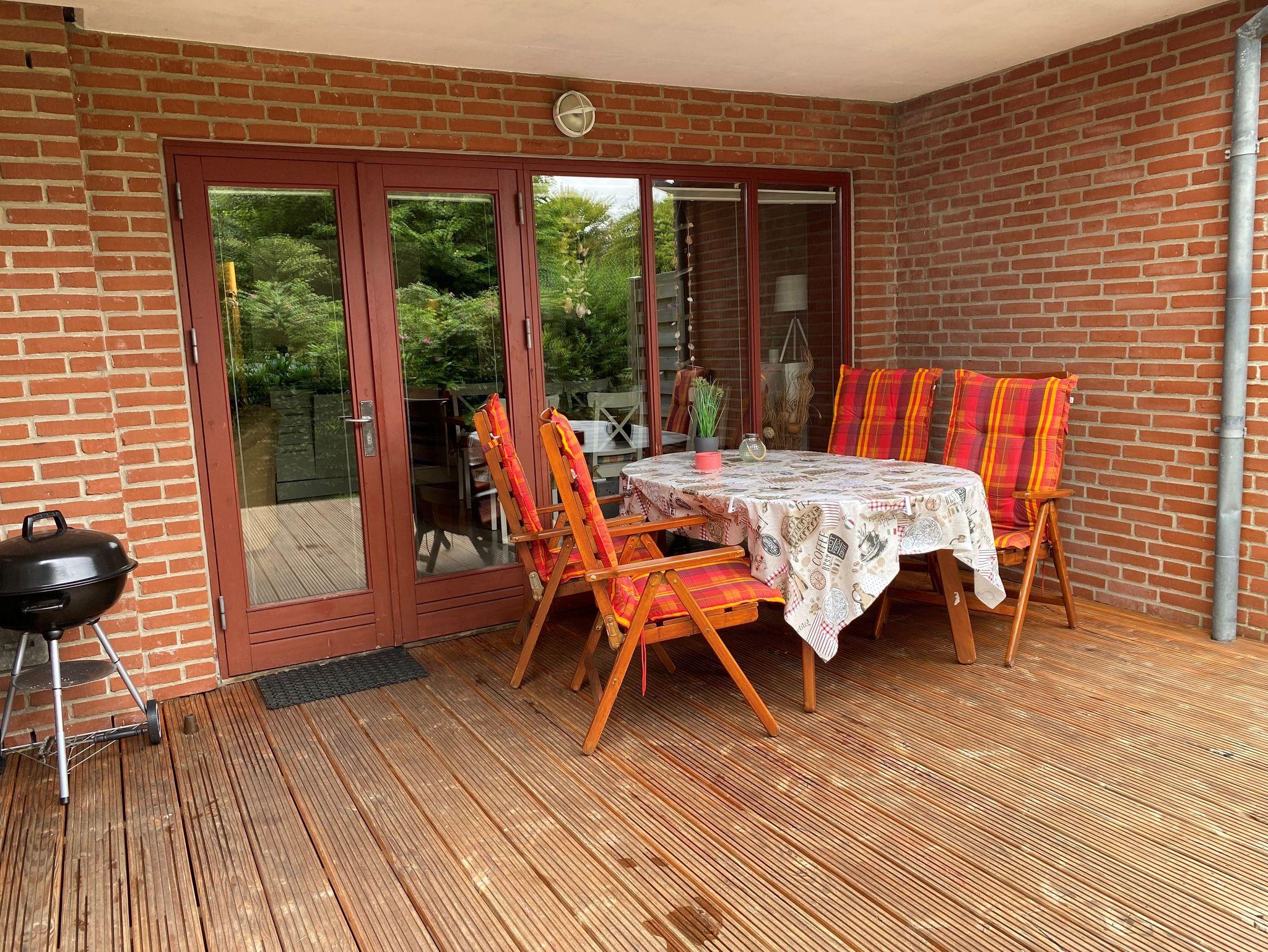 • 1 große Terrasse mit Gartenmöbeln, Sonnenschirm und Strandkorb