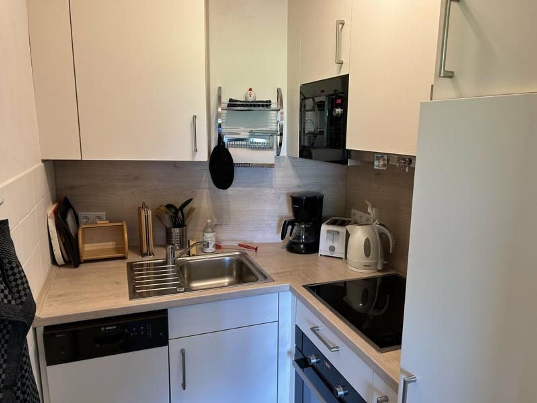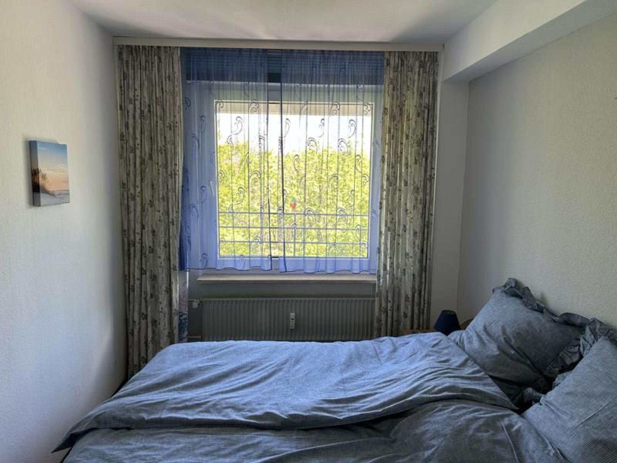 Das 43 qm große Ferienappartement erreicht man über einen Aufzug (7. Etage). Das Schlafzimmer hat ein bequemes Doppelbett und zwei Schränke mit viel Stauraum. Eine weitere Schlafmöglichkeit für eine Person gibt es im Wohnzimmer auf dem Schlafsofa. Der Wohnraum ist gemütlich eingerichtet mit Couchtisch, Esstisch (ausziehbar), Schlafsofa, modernem TV (Kabel), DVD-Spieler und Stereoanlage (Radio, CD, Kassetten). Die kleine, offen zum Wohnzimmer ausgerichtete Küche ist sehr gut ausgestattet: Geschirrspülmaschine, Mikrowelle, Backofen, Cerankochfeld, Toaster, Wasserkocher, Kaffeemaschine, Kühlschrank, separate Tiefkühleinheit und vieles mehr.