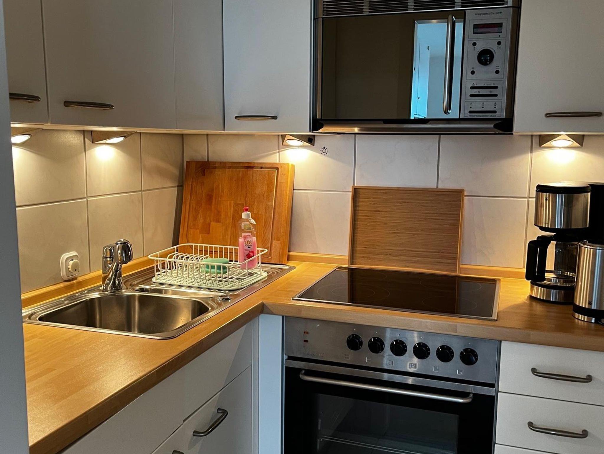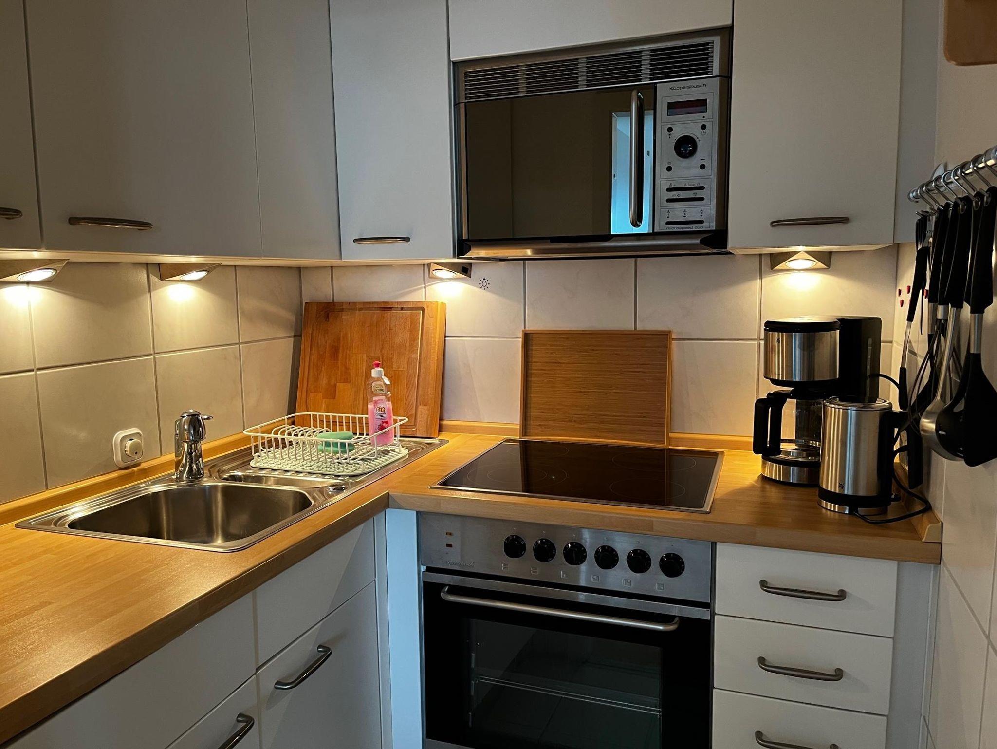 • 1 Küche mit Kaffeemaschine, Toaster, Wasserkocher, Backofen, Herd, Mikrowelle und was dazu gehört.