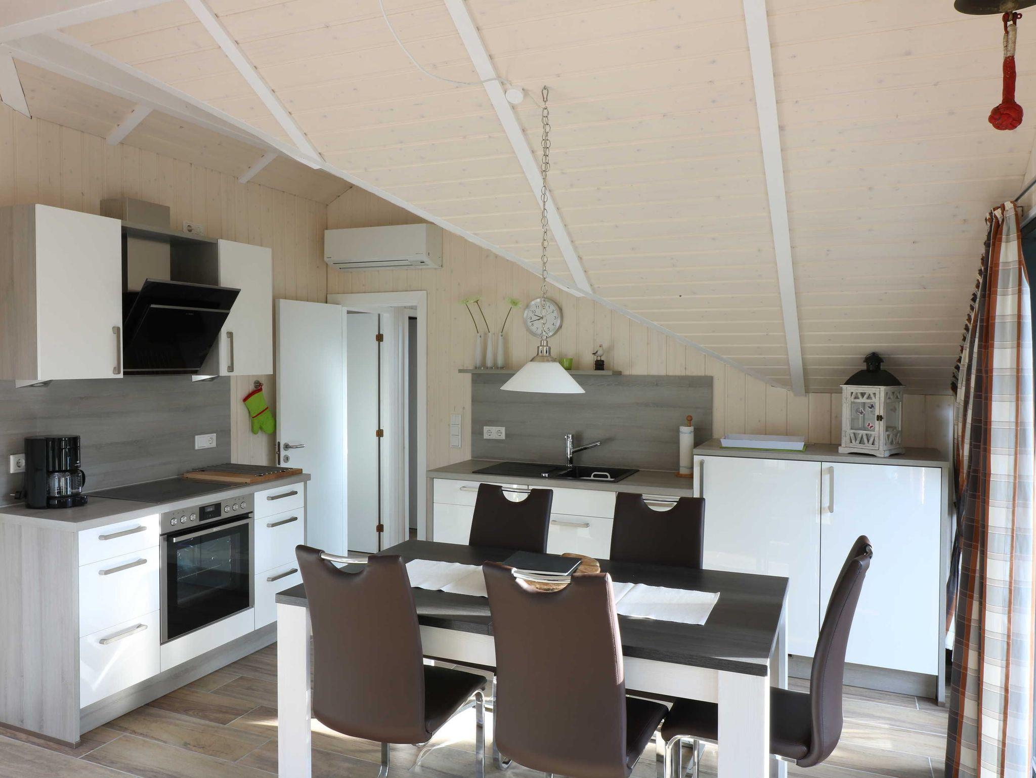 Auf 60 qm Grundfläche verteilen sich eine Wohnküche mit Essbereich, Schlafcouch und Kaminofen, ein separates Wohnzimmer, 2 Schlafzimmer mit Doppelbett (2x80x200 cm) und ein Duschbad mit Fußbodenheizung.