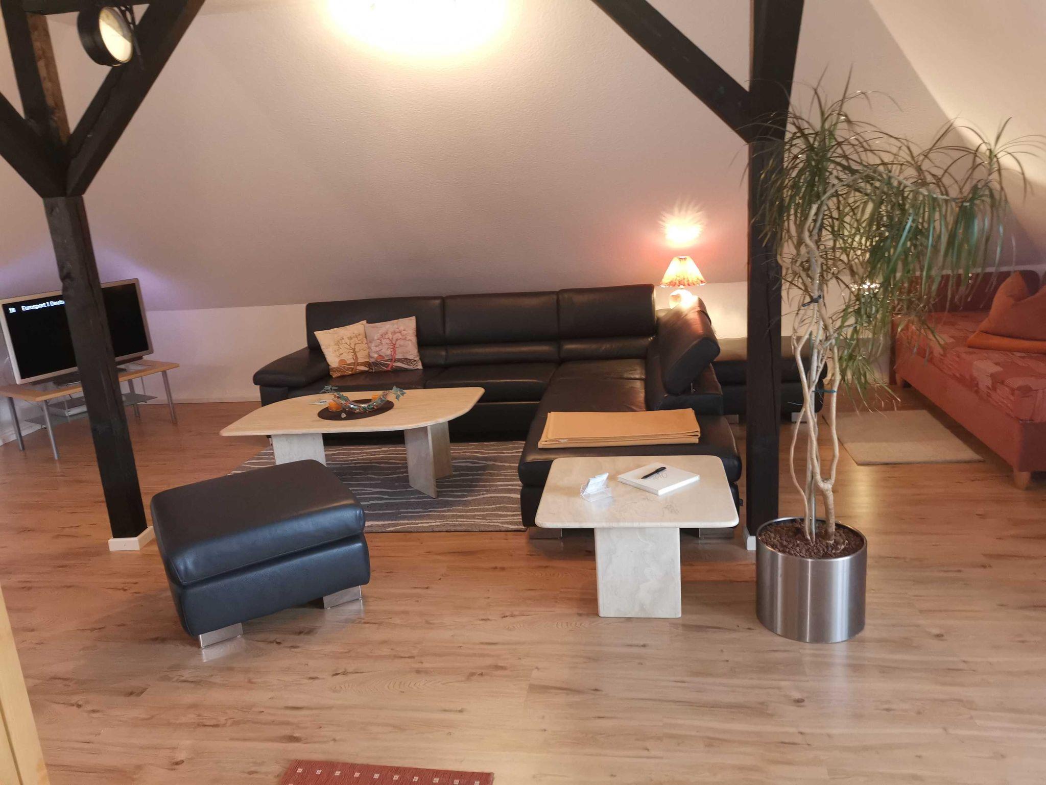 In der Wohnung befindet sich ein Doppelbett 1,80 m × 1,90 m, eine Schlafcouch 90 cm × 200 cm sowie eine gemütliche Sitzecke mit 2 zusätzlichen Fußhockern mit Wohnzimmertisch, welche zu einem entspannten Spiele- oder Fernsehabend einlädt. Im Zimmer ebenfalls vorhanden ist ein Fernseher, SAT-Anlage, Receiver und Radio.