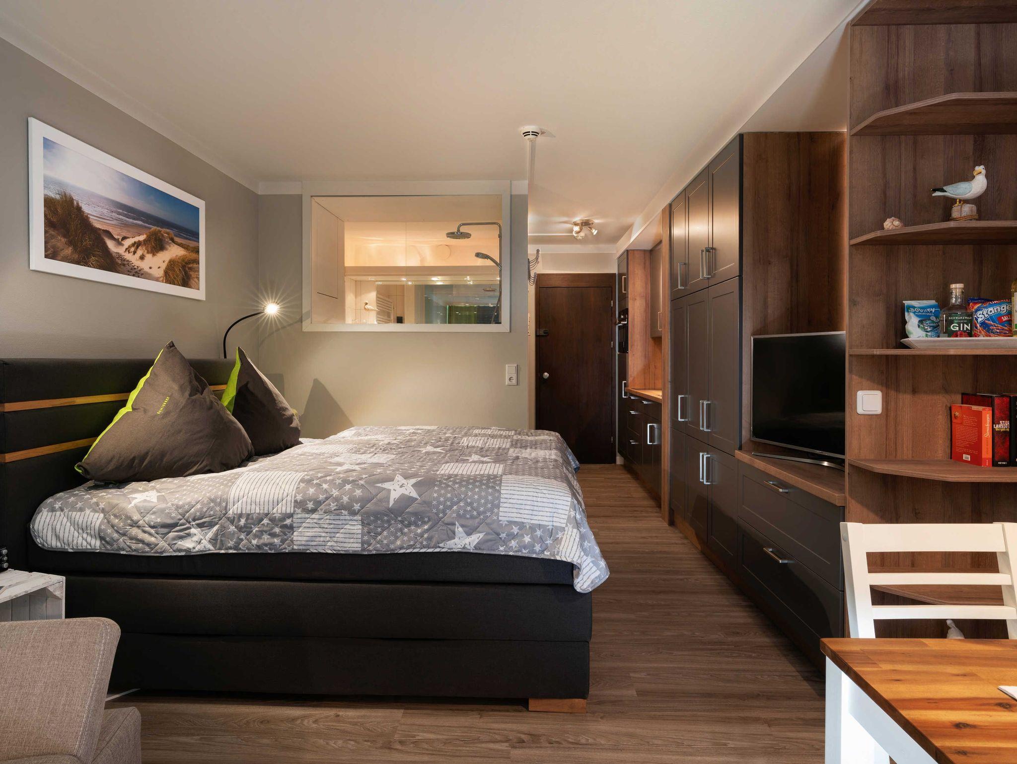 Der behagliche Wohn-/ Schlafraum mit großem Boxspringbett verfügt über eine moderne Küchenzeile und einen gemütlichen Sitzbereich. Ein Schlafsofa bietet Platz für 2 Kinder oder 1 Erwachsenen. Vom Balkon in Sonnenlage genießen Sie den Ausblick ins Grüne.