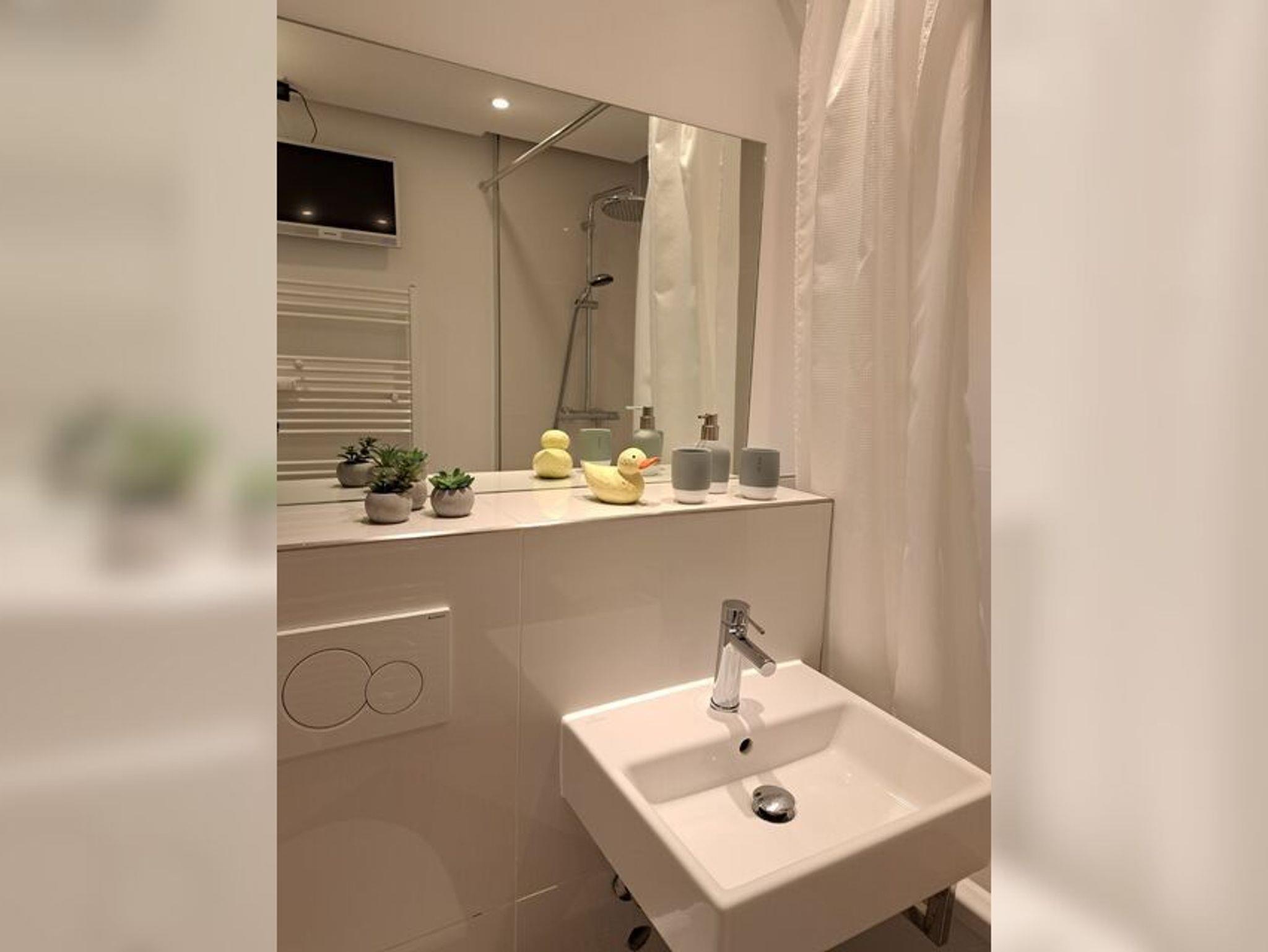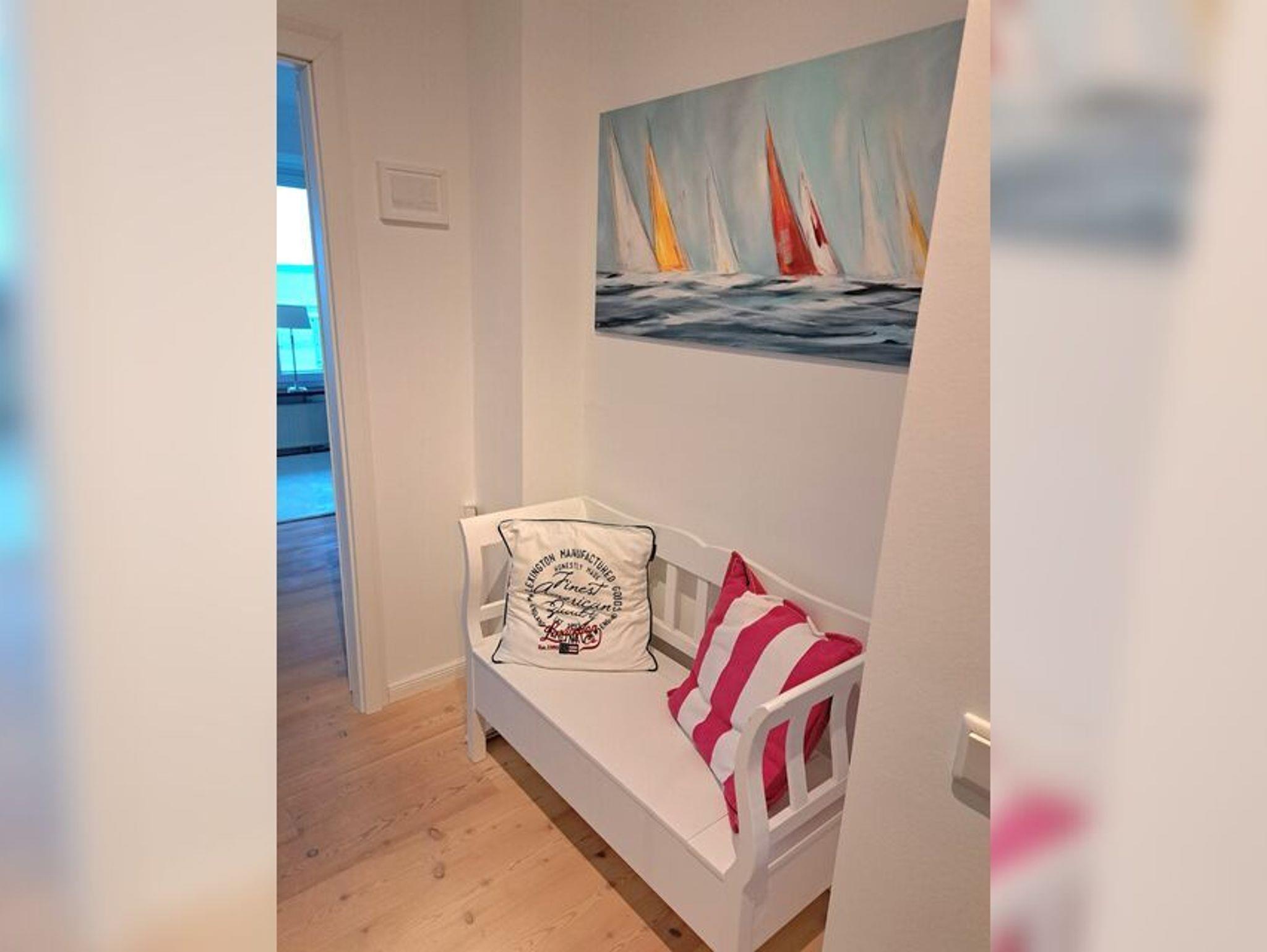 Sie verfügt über ein Wohnzimmer, einer kleinen Küche, ein Schlafzimmer mit einem Boxspringbett (1,80 x 2,00 m, Bettdecken 1,55 x 2,20 m), ein Duschbad und einem Balkon.