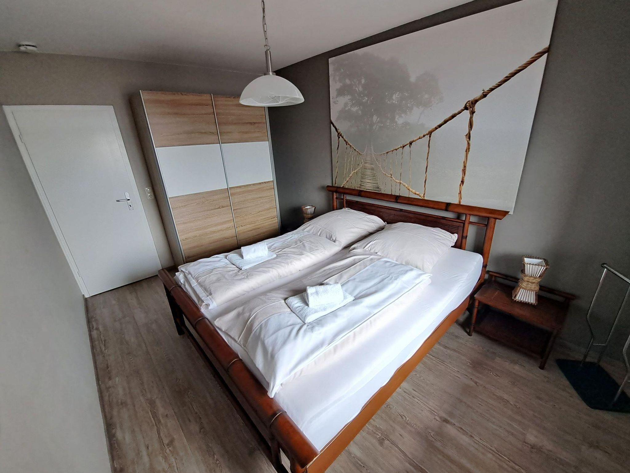 • Schlafzimmer mit Doppelbett (Kingsize), Kleiderschrank, Herrendiener und direkten Meerblick