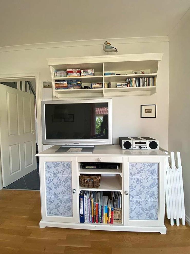 Der gemütliche Wohnbereich ist mit einem bequemen Sofa und einem modernen, streamingfähigen Fernseher ausgestattet. Bücher und Spiele stehen für kurzweilige Abende bereit, während das Glasfaser-WLAN jederzeit für eine schnelle Internetverbindung sorgt.