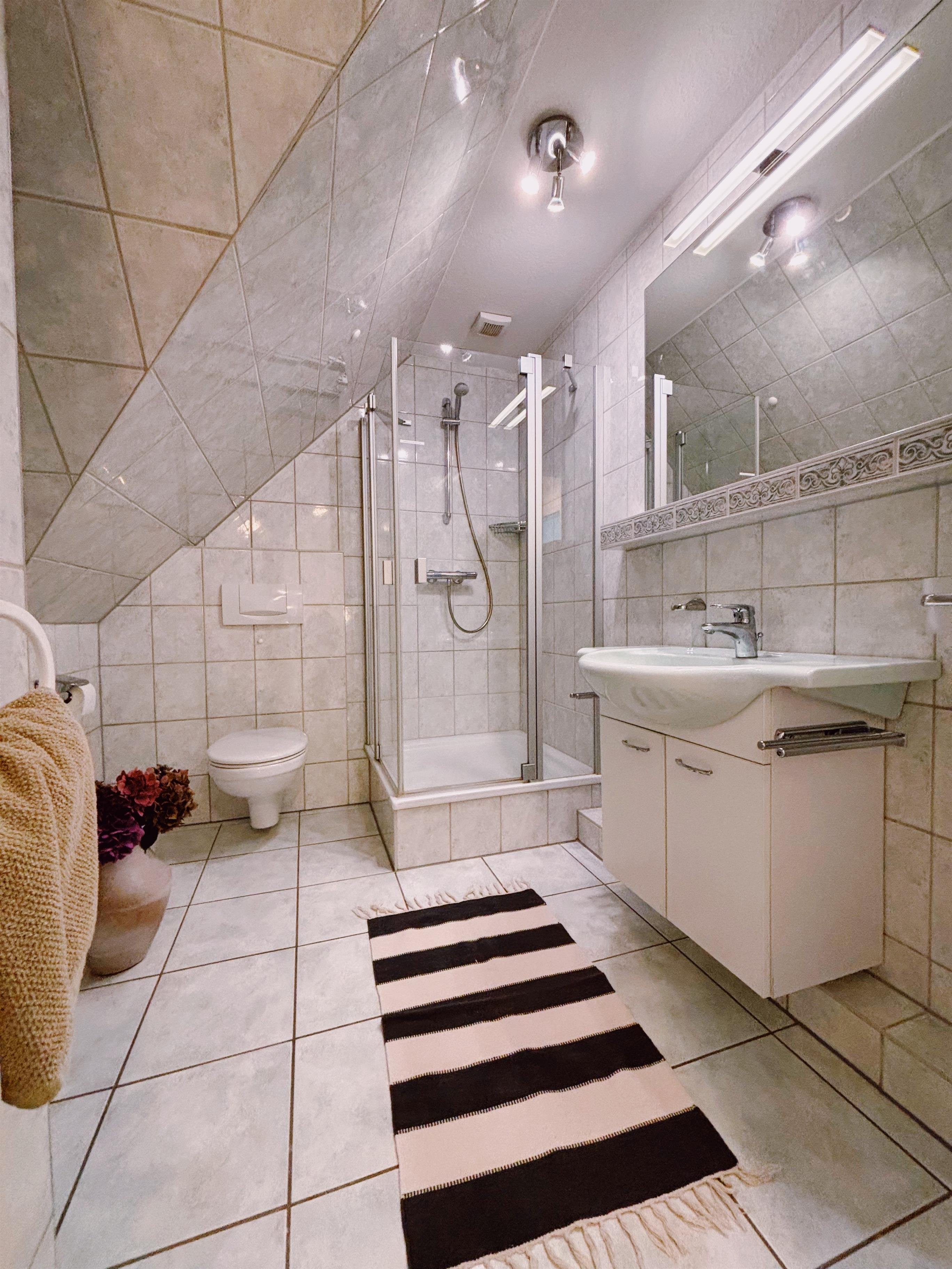 Im Erdgeschoss befindet sich außerdem ein Gäste-WC, das zusätzlichen Komfort bietet. Im ersten Obergeschoss finden Sie das Duschbad sowie zwei ruhig gelegene Schlafzimmer, die perfekt zum Entspannen und Erholen einladen. Beide Schlafzimmer sind liebevoll eingerichtet und bieten eine behagliche Atmosphäre, in der Sie nach einem erlebnisreichen Tag an der Förde zur Ruhe kommen können. Die hochwertige Ausstattung sorgt dafür, dass Sie sich sofort wie zu Hause fühlen werden.