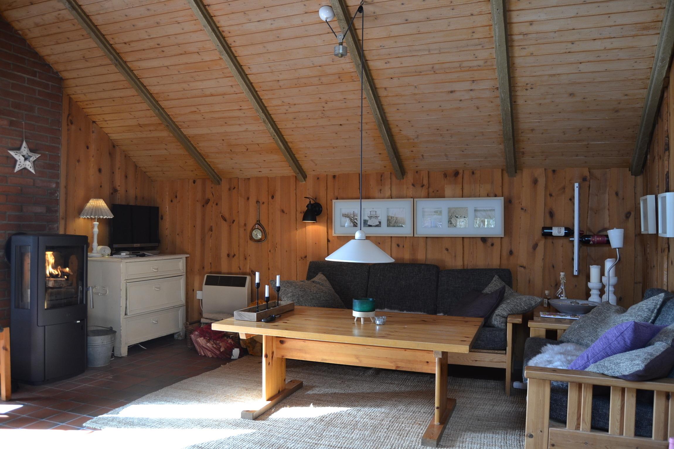 Wohnzimmer: Großzügiger und heller Wohnbereich mit Kaminofen, bequemen Sitzgelegenheiten und einem gemütlichen Essbereich.