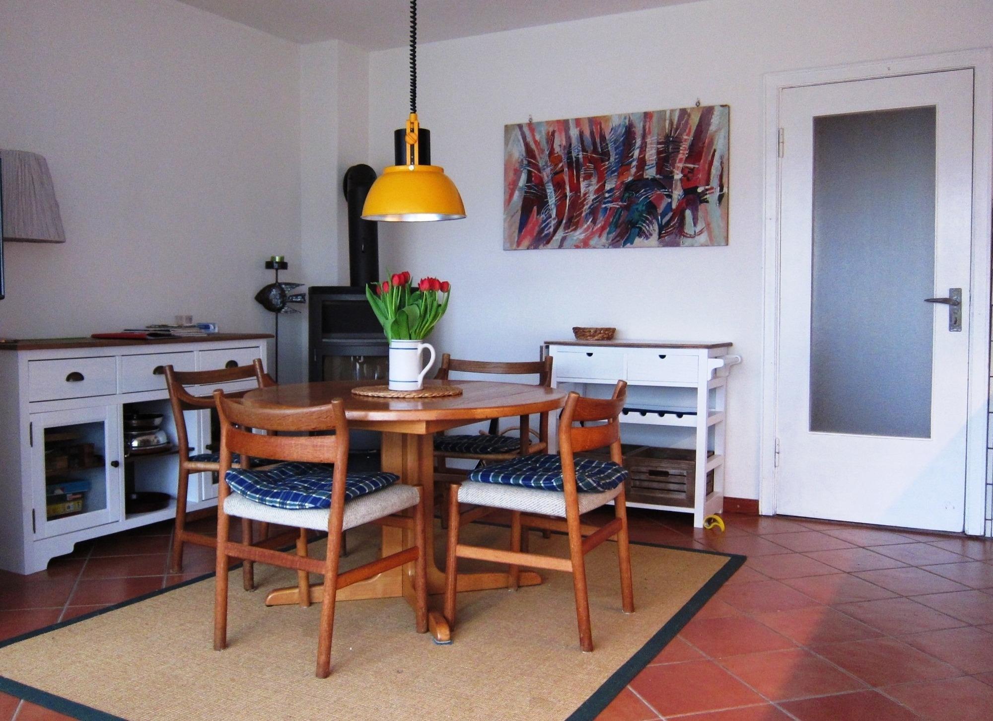 Der offene Ess- und Küchenbereich ist stilvoll in das Wohnzimmer integriert. Ein großer Esstisch bietet ausreichend Platz für gemeinsame Mahlzeiten, die Sie in der voll ausgestatteten Küchenzeile zubereiten können. Diese verfügt über einen Herd mit Backofen und Cerankochfeld, eine Spülmaschine, eine Mikrowelle sowie einen Wasserkocher und eine Kaffeemaschine. An kühleren Abenden sorgt der Kaminofen für eine gemütliche Atmosphäre. Geschirr, Besteck und Kochutensilien sind selbstverständlich vorhanden, sodass Sie sich wie zu Hause fühlen können.