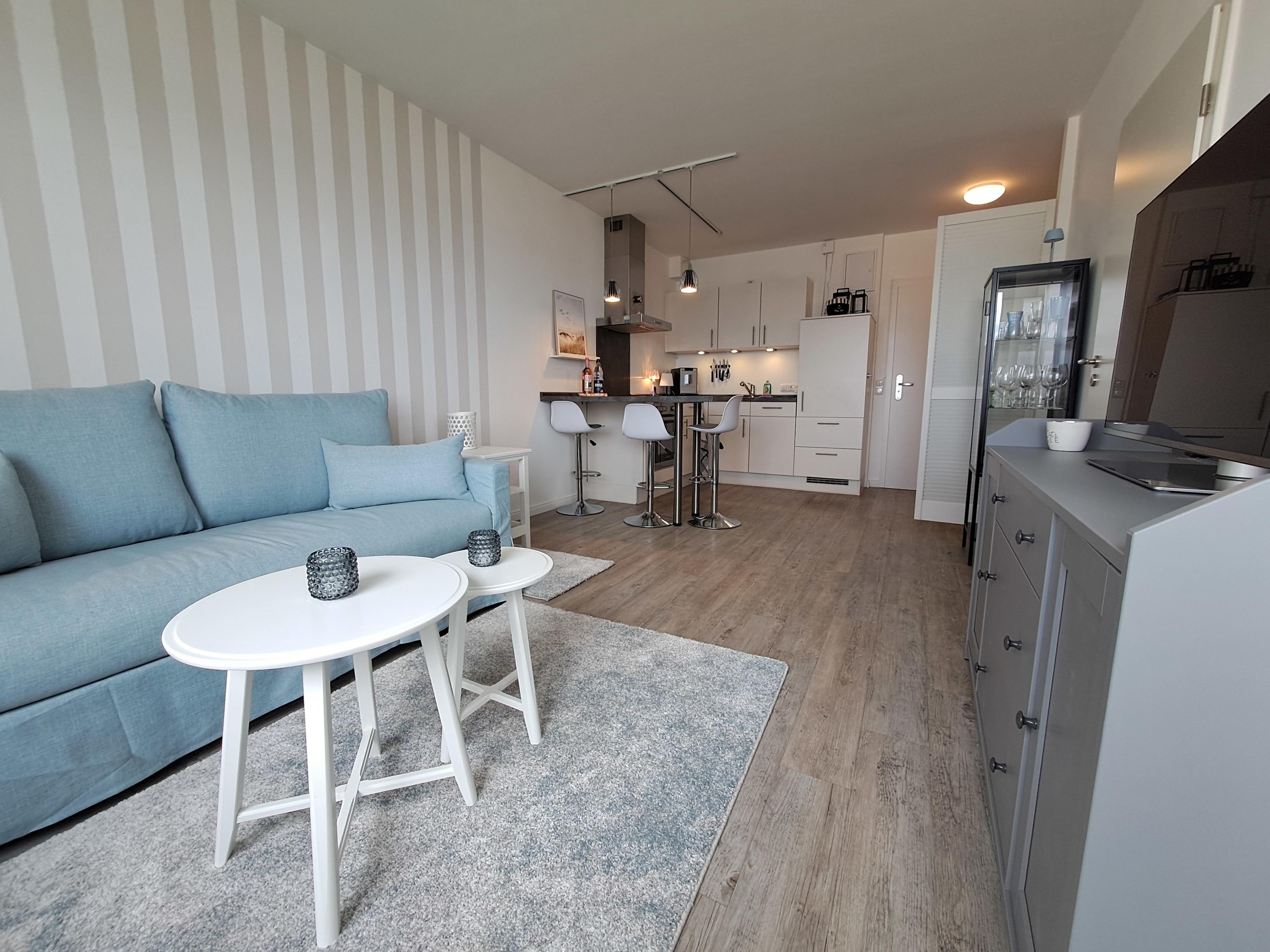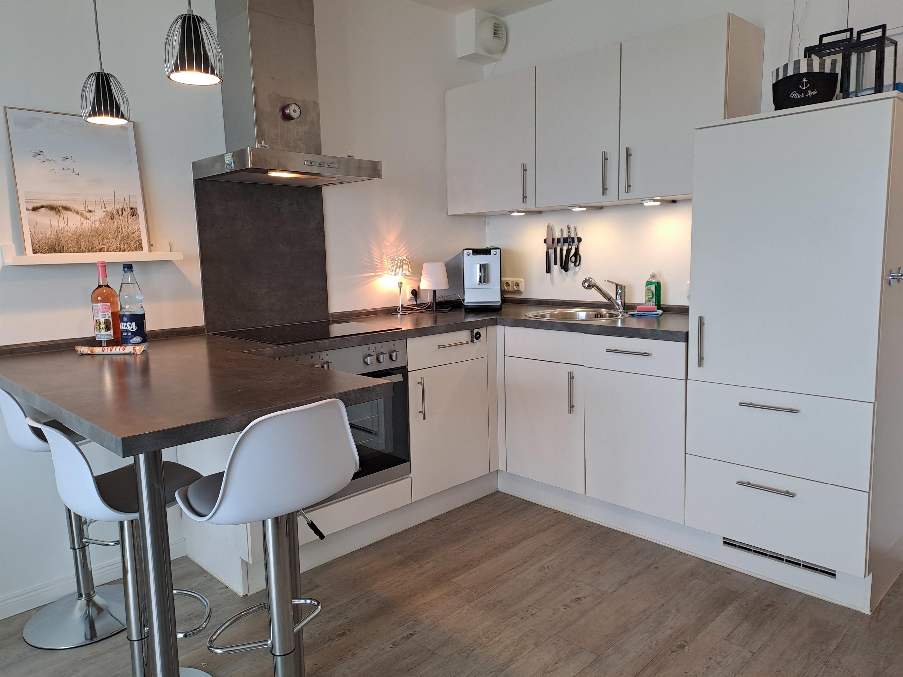 Die Ferienwohnung wurde mit viel Liebe zum Detail eingerichtet. Der gemütliche Wohnraum bietet Ihnen alles, was Sie für einen entspannten Aufenthalt benötigen: Ein Esstresen lädt zu gemeinsamen Mahlzeiten ein, während die 160 cm breite Bettcouch, die zusätzlich als Schlafgelegenheit dient, einladend zum Entspannen vor dem Fernseher einlädt. Die komplett ausgestattete Einbauküche lässt keine Wünsche offen – hier können Sie Ihre Lieblingsgerichte zubereiten. Sie finden ein Kochfeld, einen Backofen, einen Kühl- und Gefrierschrank sowie einen Kaffeevollautomaten, der Ihnen jeden Morgen den perfekten Kaffeegenuss beschert. Ein Wasserkocher rundet die Ausstattung ab.