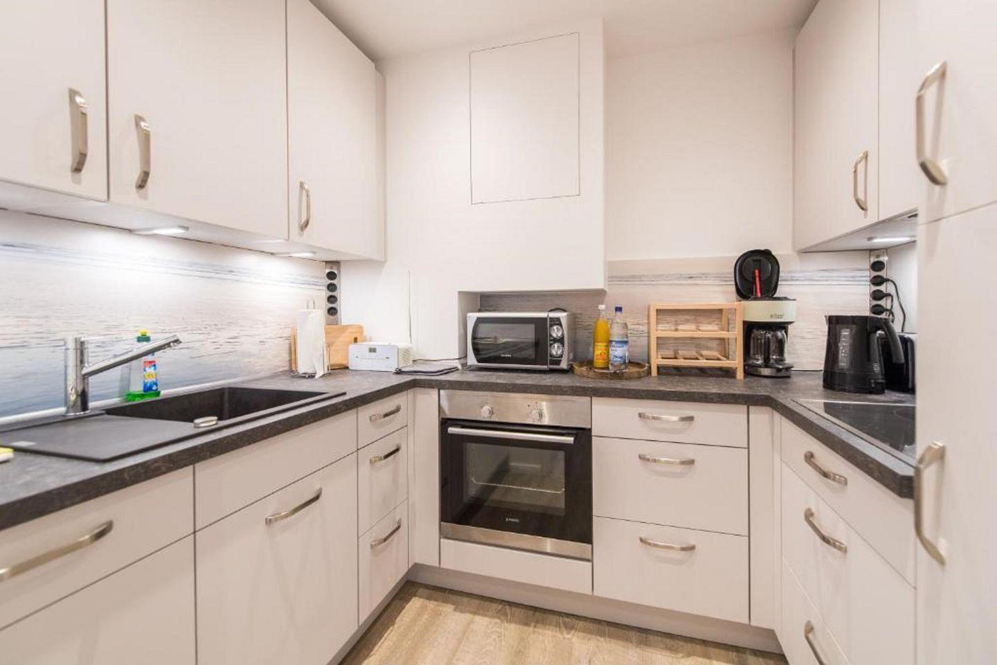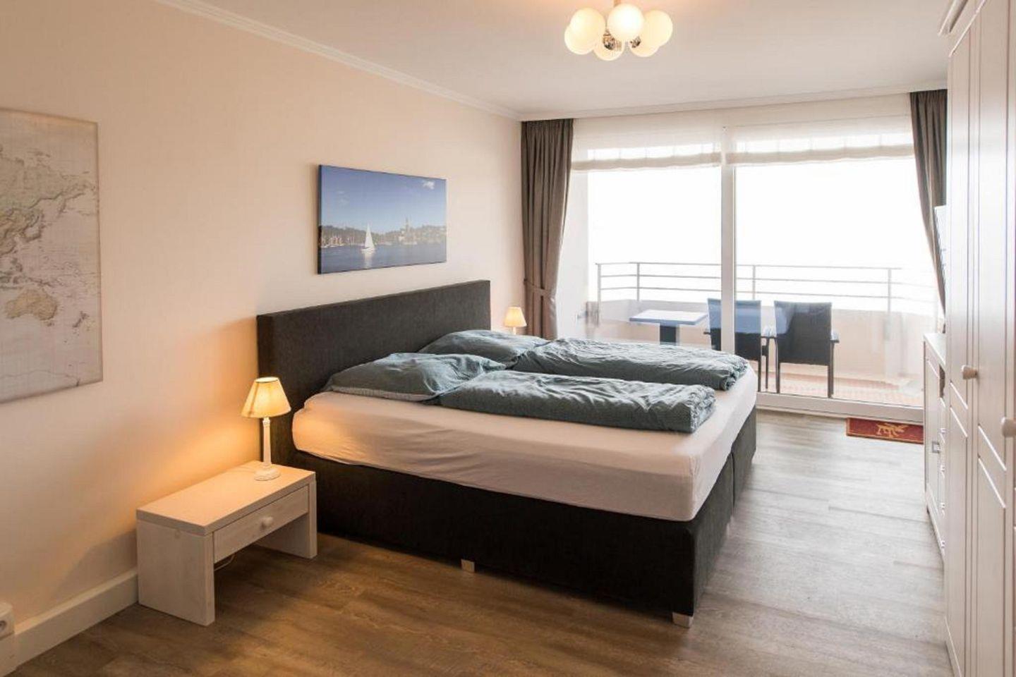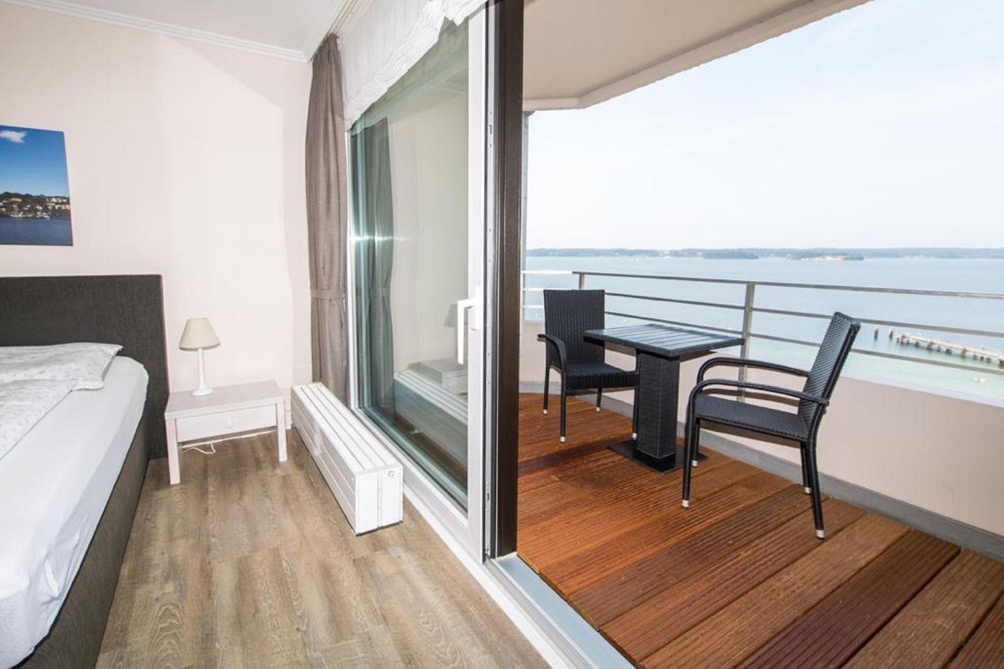 Diese charmante Ferienwohnung liegt nur wenige Meter vom Wasser entfernt, mit knapp 60m² bietet sie Ihnen bodentiefe Fenster mit einzigartigem Wasserblick. Es gibt 1 Schlafzimmer mit 1 gemütlichen Doppelbett, einen hellen Wohn-/ und Essbereich mit angrenzender voll ausgestatteter Küche, zusätzlich eingerichtet mit einem TV & einem Schlafsofa. Das helle Badezimmer verfügt über eine ebenerdige Dusche. Das absolute Highlight: der Balkon, der einen atemberaubenden Ausblick über die Ostsee bietet.