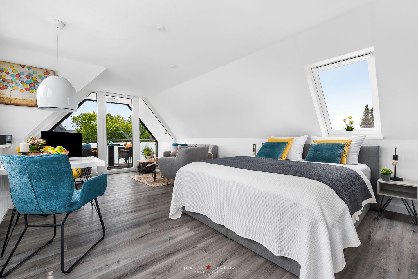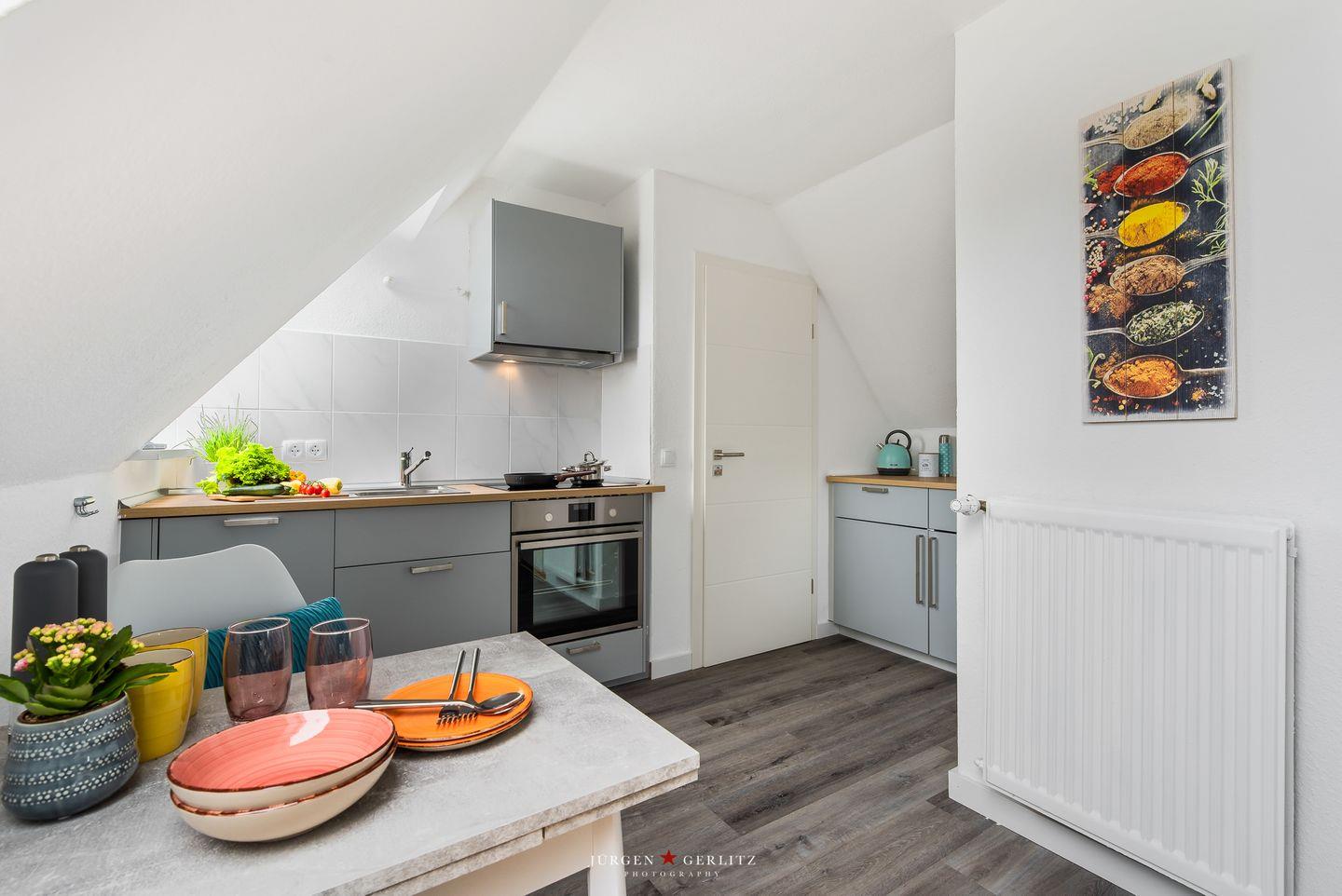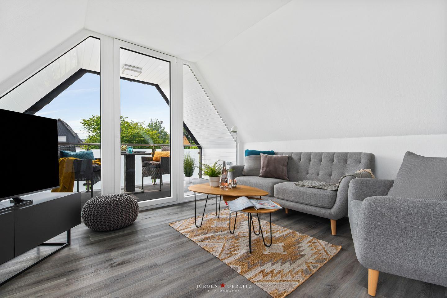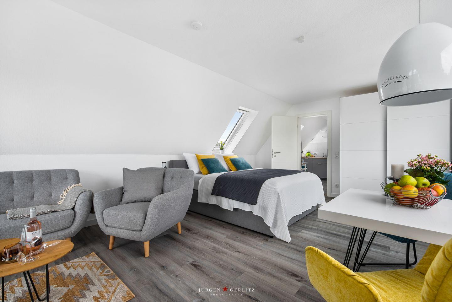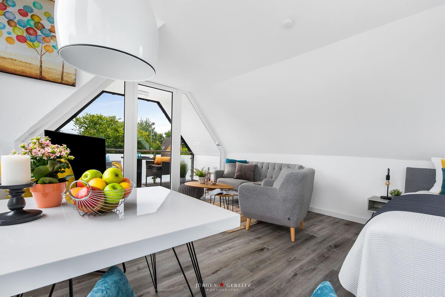 Willkommen in der Ferienwohnung "Beste Stuuv"! An der Flensburger Förde gelegen und in ruhiger Lage befindet sich im ersten Obergeschoss die Wohnung mit knapp 45m², bietet Sie Ihnen, neben einem offenen Wohn-/Schlafbereich, eine Küche und ein Badezimmer mit Dusche. Der loftartige Wohnraum ist in einem modernen Stil gehalten und trotzdem gemütlich und wohnlich und mit einem Flatscreen-TV ausgestattet. Dort können Sie sich nach langen Spaziergängen herrlich entspannen. Für einen erholsamen Schlaf sorgt ein gemütliches Doppelbett (180x200cm), welches sich ebenfalls in dem offenen Wohn-/Schlafbereich befindet. Im Giebel kann man das Wetter zu jeder Jahreszeit auf dem überdachten Balkon genießen. Auf dem Grundstück befindet sich ein abschließbarer Schuppen, in welchem Fahrräder untergestellt werden können. Dieser Schuppen wird mit der zweiten Wohnung vor Ort geteilt. Für einen Urlaub mit mehr Personen kann zusätzlich die zweite Wohnung "Lütte Deern" dazu gebucht werden.