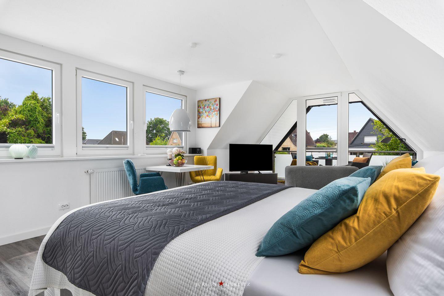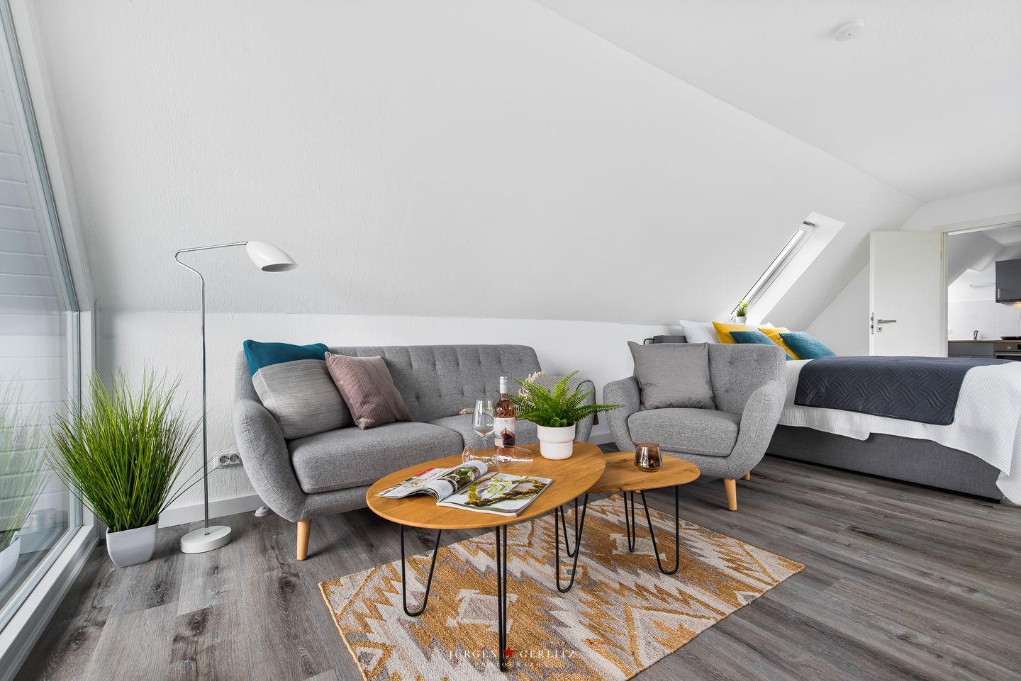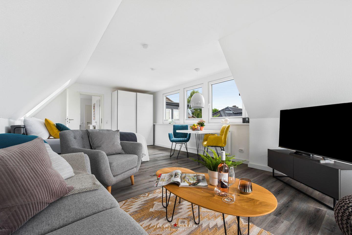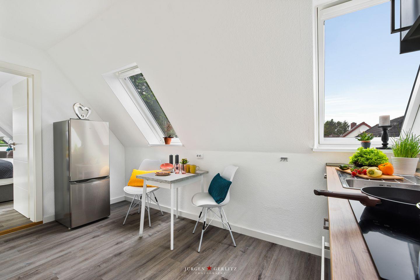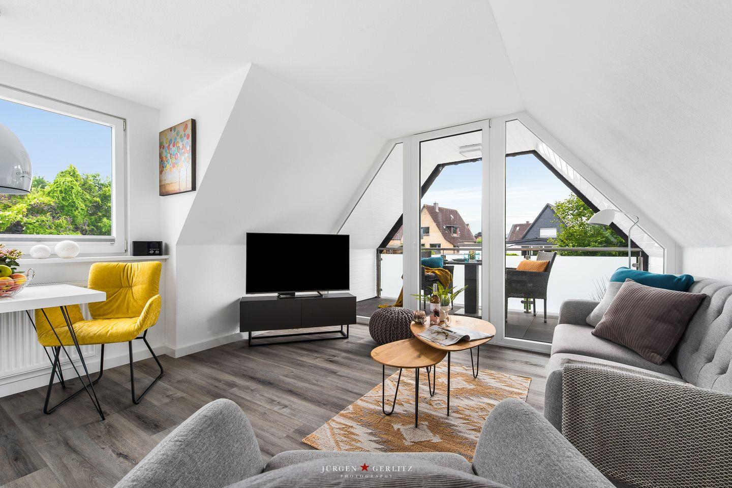 Willkommen in der Ferienwohnung "Beste Stuuv"! An der Flensburger Förde gelegen und in ruhiger Lage befindet sich im ersten Obergeschoss die Wohnung mit knapp 45m², bietet Sie Ihnen, neben einem offenen Wohn-/Schlafbereich, eine Küche und ein Badezimmer mit Dusche. Der loftartige Wohnraum ist in einem modernen Stil gehalten und trotzdem gemütlich und wohnlich und mit einem Flatscreen-TV ausgestattet. Dort können Sie sich nach langen Spaziergängen herrlich entspannen. Für einen erholsamen Schlaf sorgt ein gemütliches Doppelbett (180x200cm), welches sich ebenfalls in dem offenen Wohn-/Schlafbereich befindet. Im Giebel kann man das Wetter zu jeder Jahreszeit auf dem überdachten Balkon genießen. Auf dem Grundstück befindet sich ein abschließbarer Schuppen, in welchem Fahrräder untergestellt werden können. Dieser Schuppen wird mit der zweiten Wohnung vor Ort geteilt. Für einen Urlaub mit mehr Personen kann zusätzlich die zweite Wohnung "Lütte Deern" dazu gebucht werden.