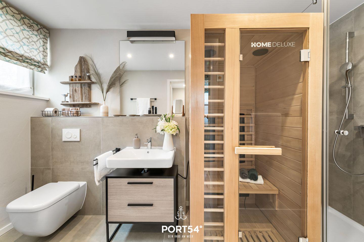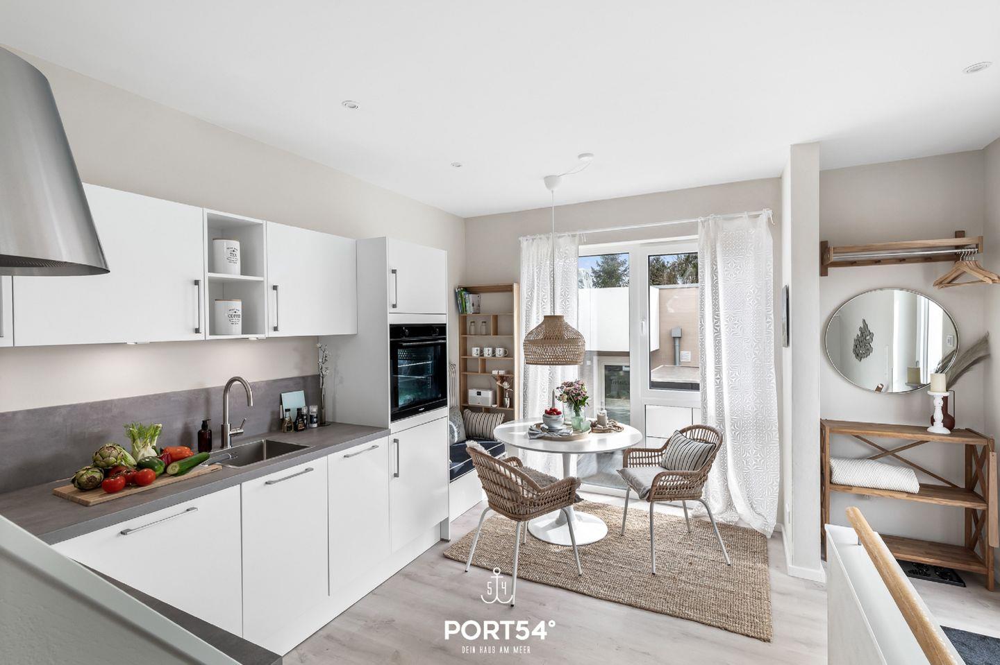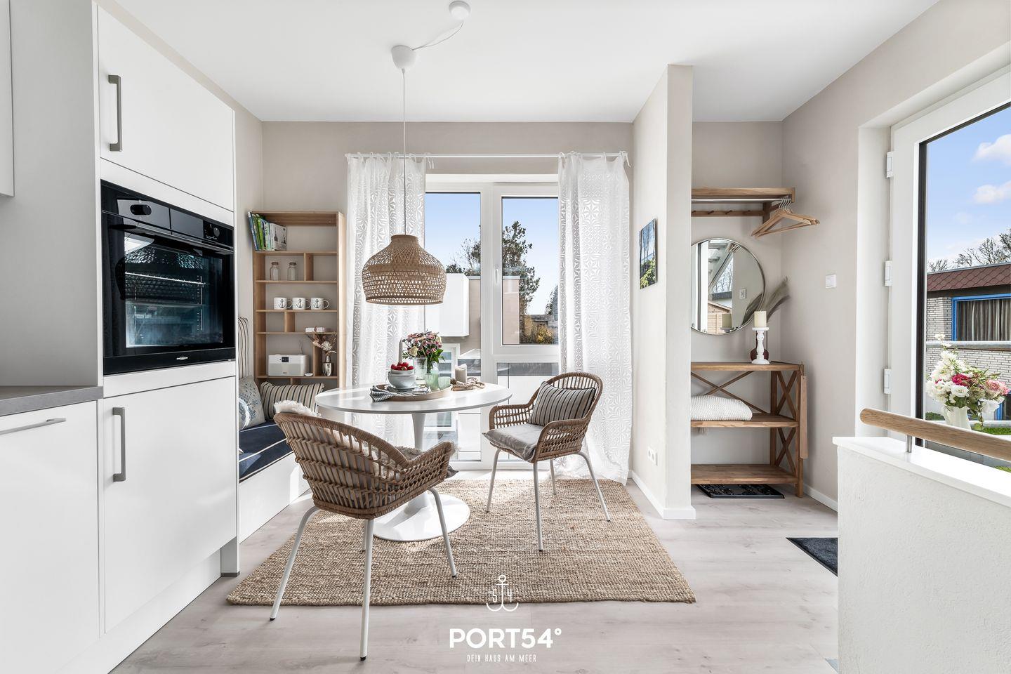 In der 2023 fertiggestellten Doppelhaushälfte "Baltic View" mit Dachterrasse und tollem Meerblick, Infrarot-Sauna, Fahrradschuppen und privatem Stellplatz finden bis zu 2 Erwachsene und 1 Kind gemütlich Platz. Rund 70m² teilen sich über Souterrain und Erdgeschoss in ein Schlafzimmer, ein Badezimmer und einen offenen Wohnbereich mit angrenzender Küche mit Essbereich auf. Die Fenster sind durch Plissees sichtgeschützt. Das Schlafzimmer im Souterrain mit TV bietet in einem Doppelbett (180×200cm) ruhige Nächte für 2 Personen. Ebenfalls im Souterrain befindet sich das Badezimmer, welches Sie mit einer bodengleichen Dusche, sowie eine Infrarot-Sauna erwartet. Eine weitere Schlafmöglichkeit (für ein Kind) bietet die bequeme Couch (140×200cm) im offenen Wohn- und Essbereich. Eines der Highlights ist die voll möblierte Dachterrasse mit einem traumhaften Blick auf die Ostsee. Hier lassen sich sonnige Frühstücke oder laue Sommerabende am Elektro-Grill verbringen. Direkt vor dem Haus befindet sich eine eigene Parkfläche.