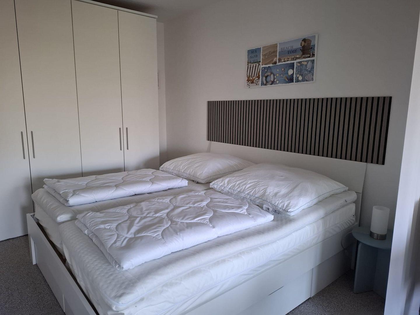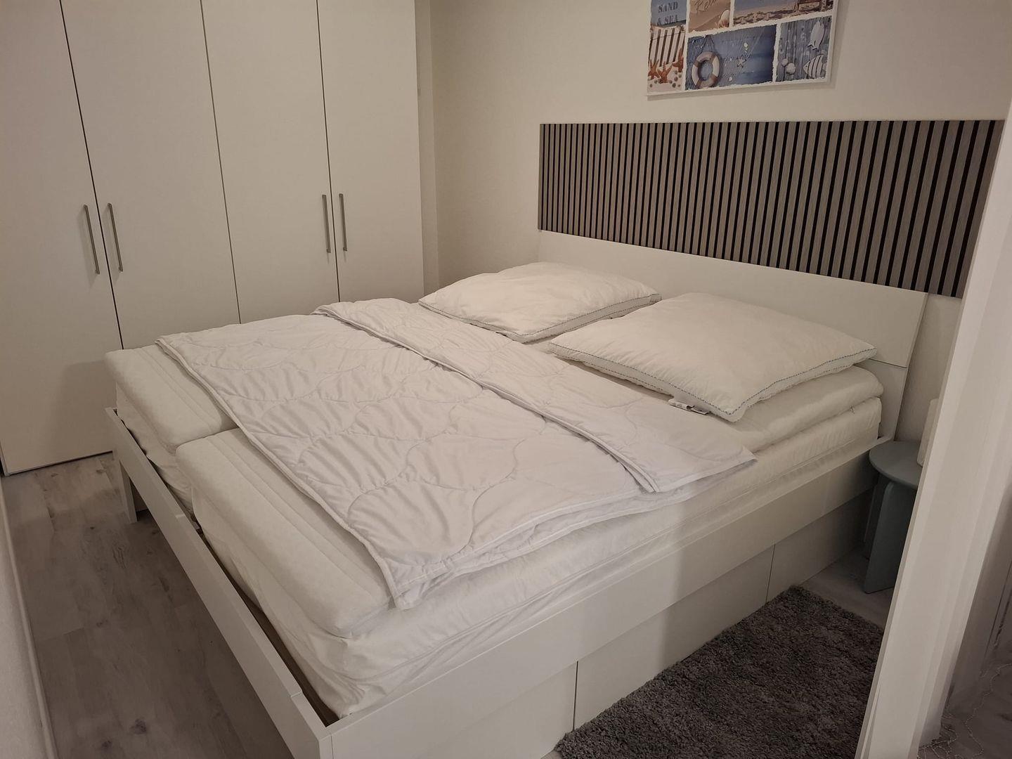 Im hinter dem Wohnzimmer zurückgezogenen Bereich dann der Schlafbereich mit neuem großem Doppelbett und großem Kleiderschrank, optisch getrennt.