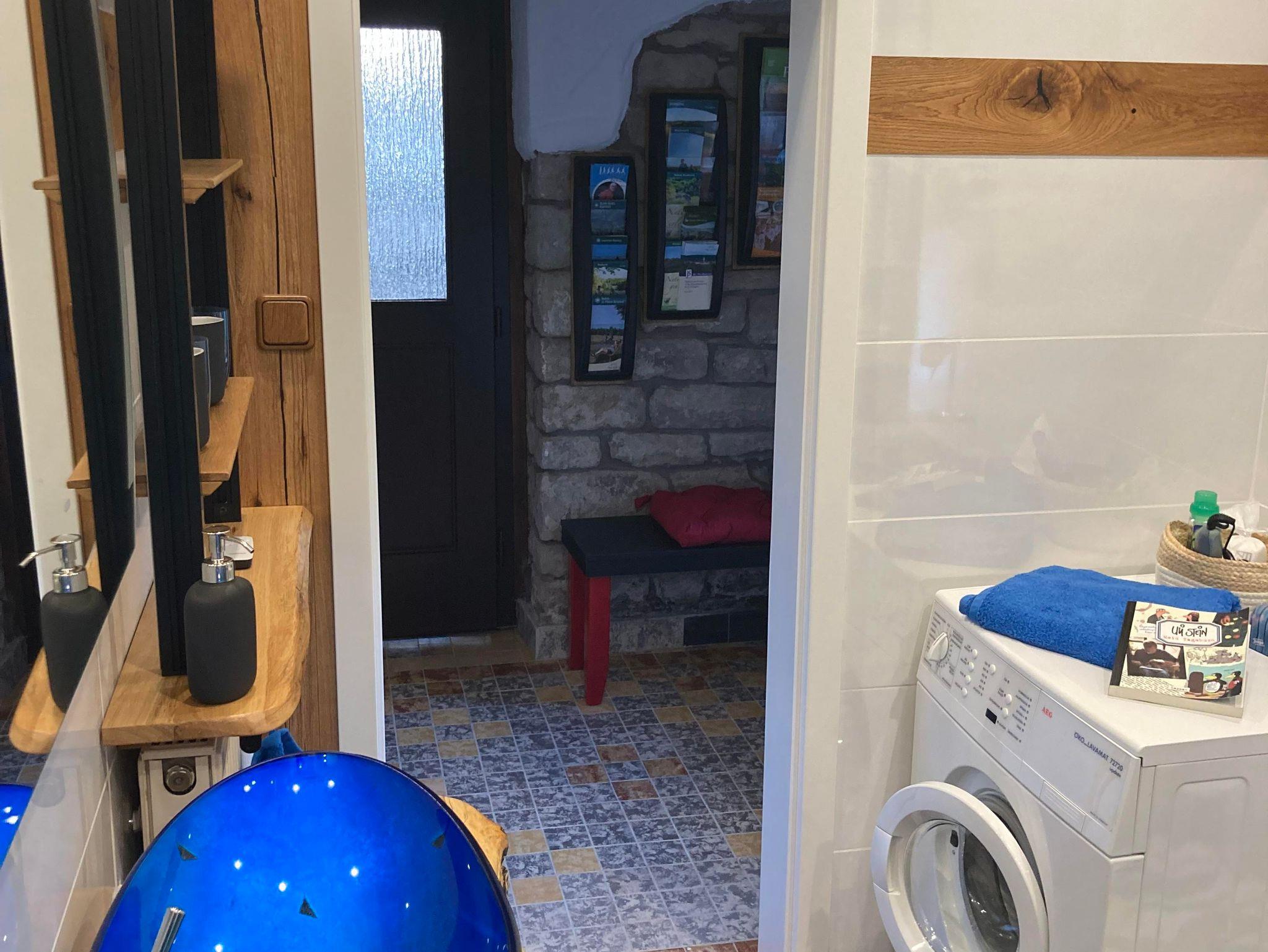 einem kleinen Flur/Eingang, 1 komplett eingerichteten Küche, 1 Wohnzimmer mit einer großen Schlafcouch und Esstisch, 1 Schlafzimmer mit Doppelbett, einer überdachten Terrasse direkt am Bachufer, 1 Badezimmer mit ebenerdiger Dusche und Waschmaschine.