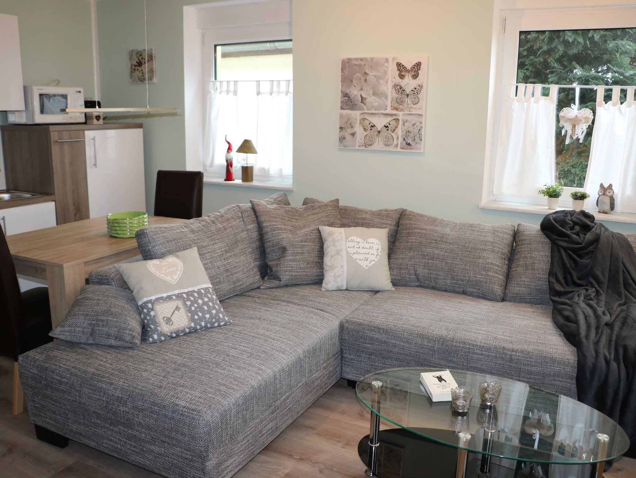 Die Ferienwohnung hat einen Wohn- Schlafraum mit Küchenzeile, darin eine Tischgruppe für die Mahlzeiten und im Wohnbereich eine Sitzcouch über Eck.
