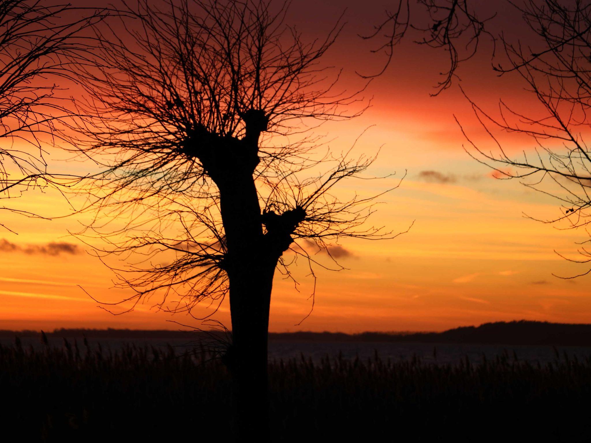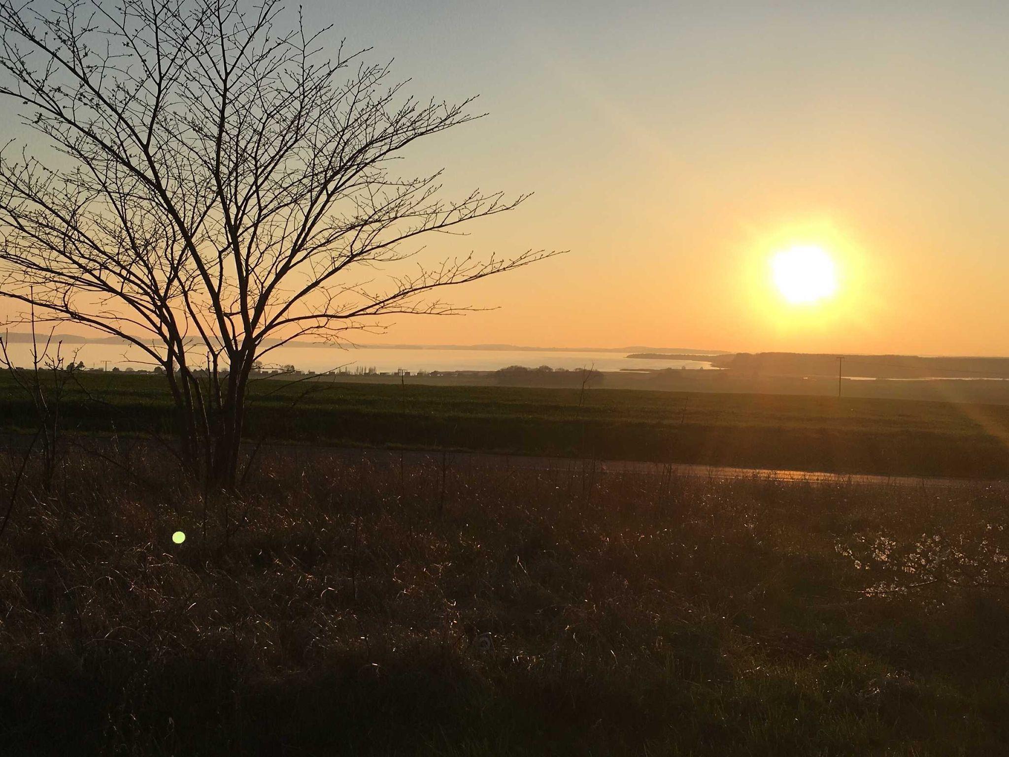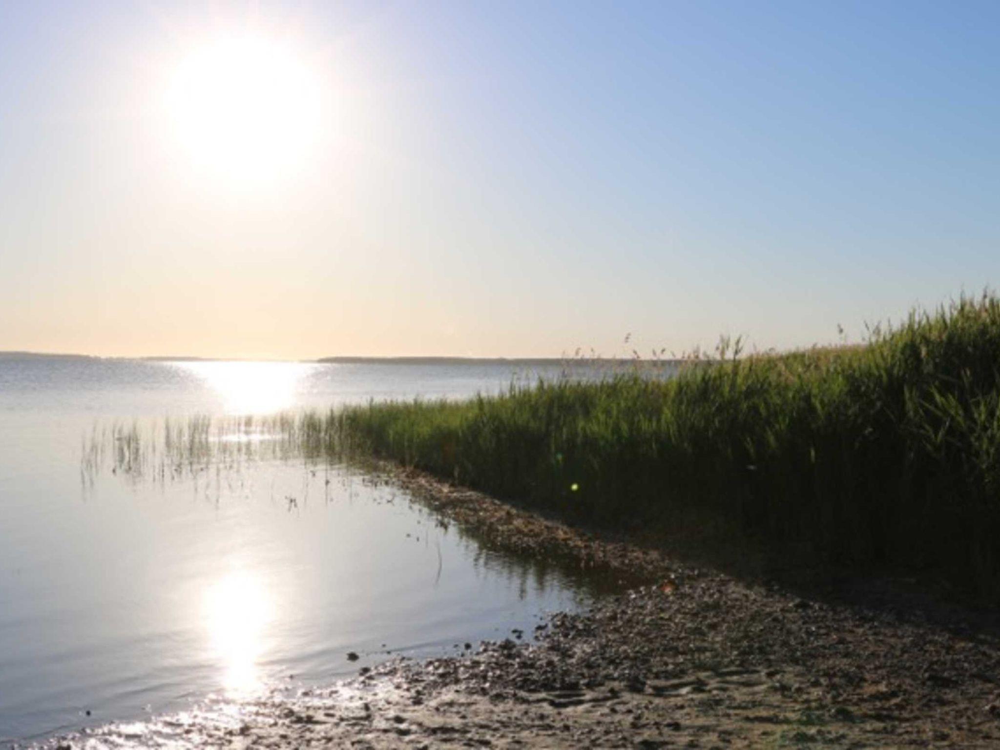 Aus dem Wohnzimmer heraus oder von Ihrer Terrasse, ausgestattet mit Sitzgruppe, schauen Sie direkt auf den Bodden, über Schilf auf die untergehende Sonne.