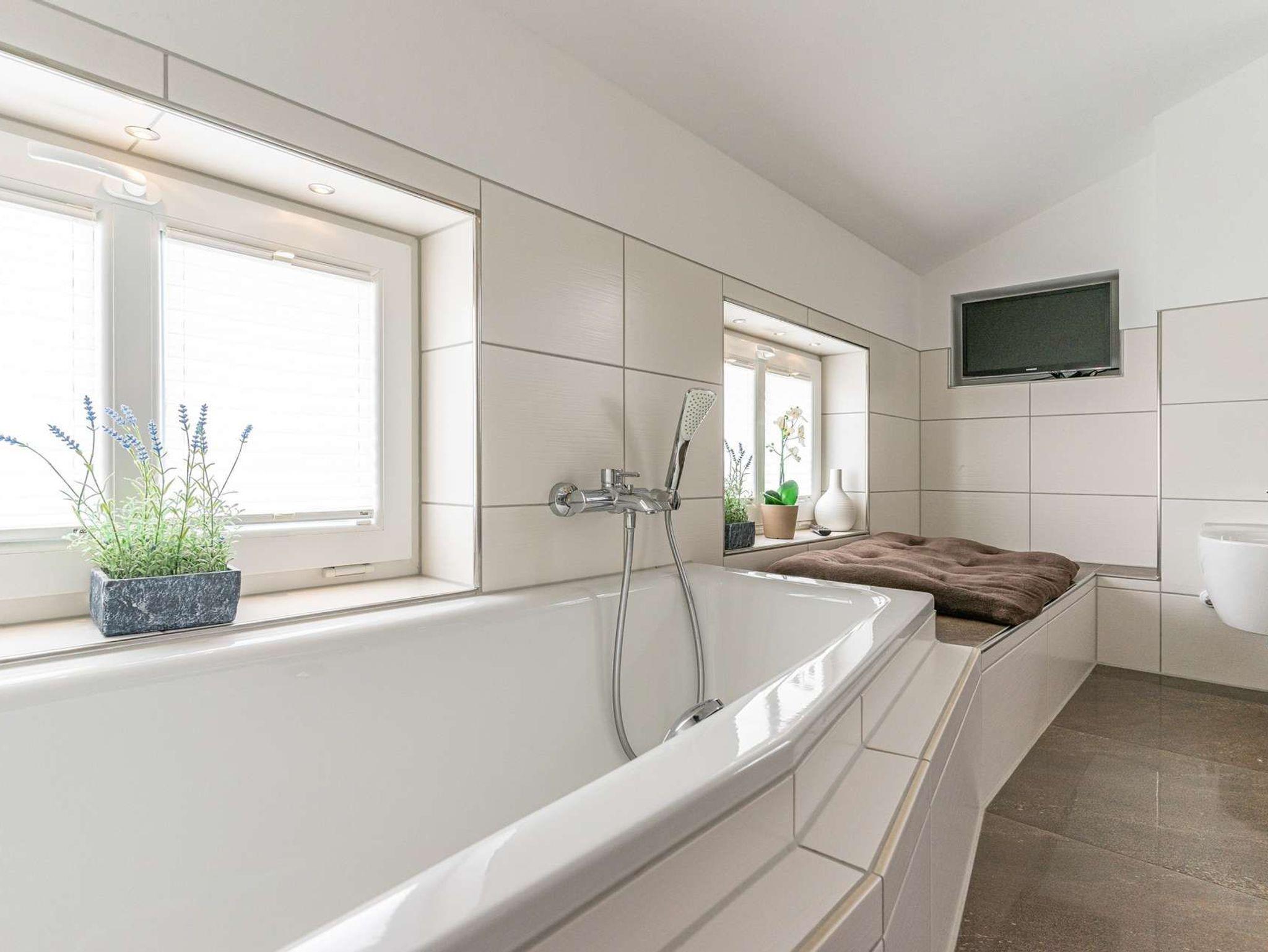 Das Badezimmer im Obergeschoss, mit bodengleicher Dusche, Badewanne, Bidet und Doppelwaschplatz garantieren höchsten Badespaß – noch dazu bei leiser Musik oder den aktuellen Nachrichten. Selbst aus der Badewanne können Sie Ihre Lieblingssendung im TV schauen. Im Erdgeschoss befindet sich noch ein Gäste-WC.