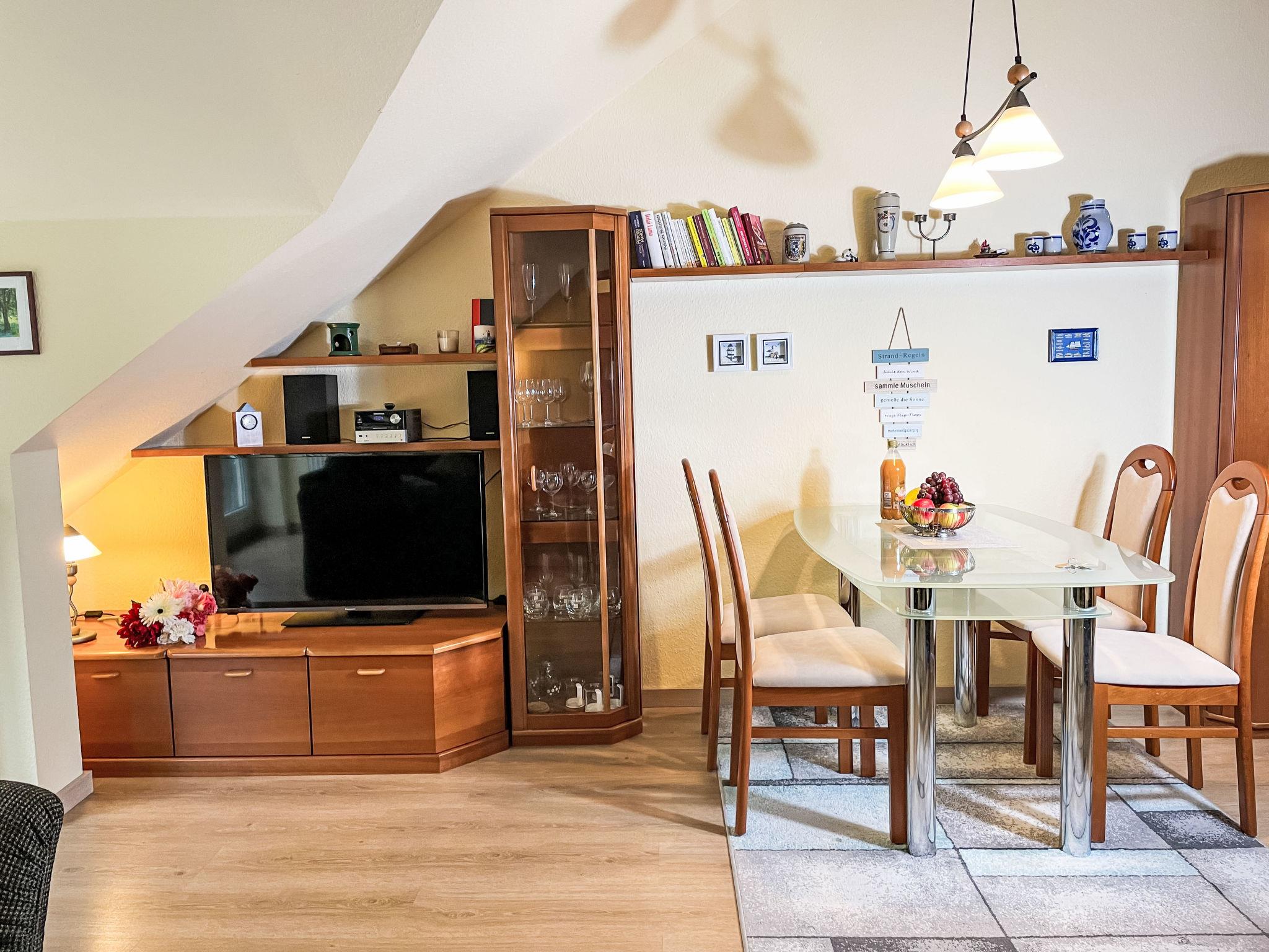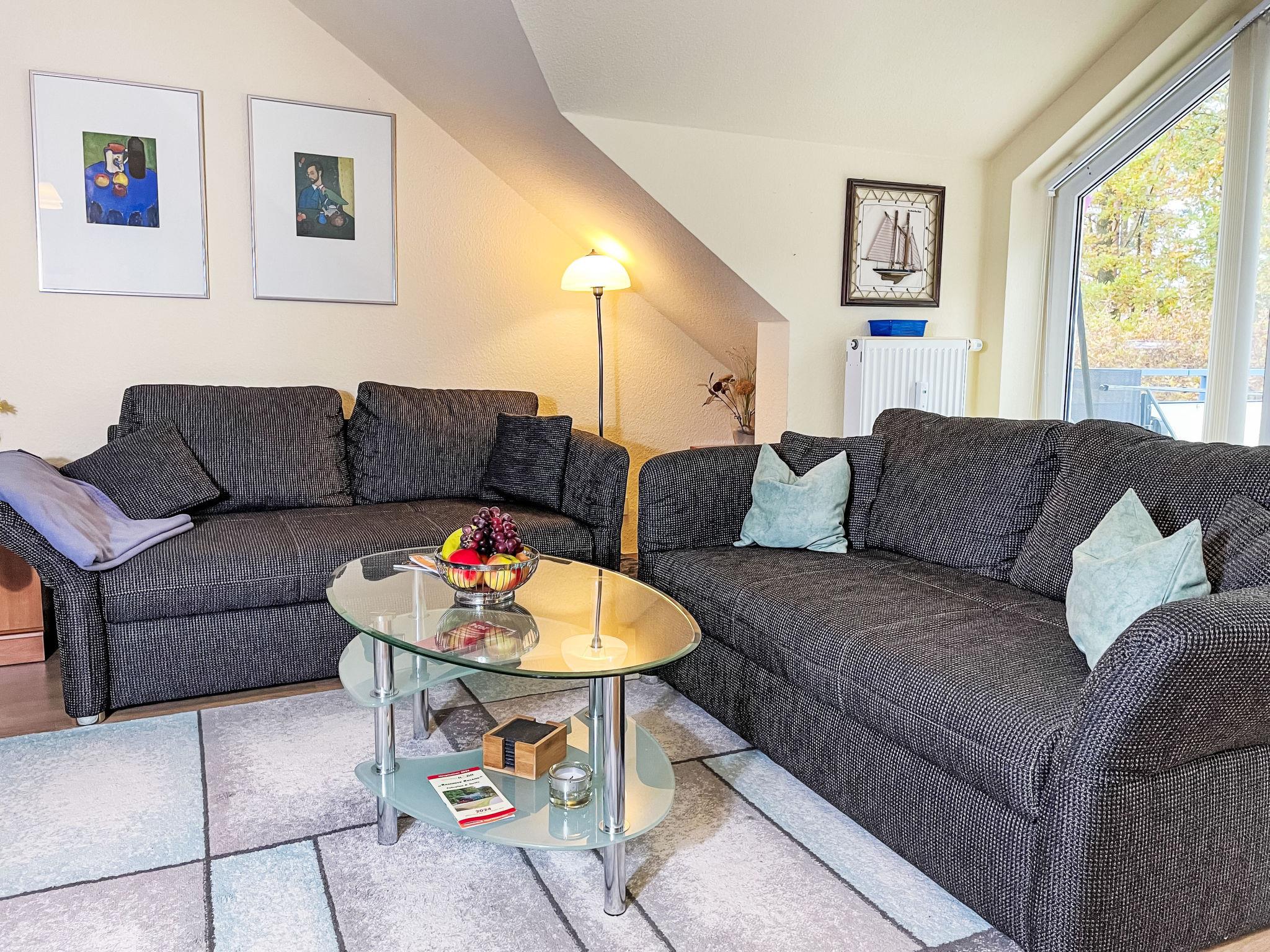 "Glowe (GLW651)", 1-room apartment 47 m2 on 1st floor. Comfortable and cosy furnishings: living/sleeping room with 1 sofabed, 1 double fold-away bed, dining table and satellite TV (flat screen), radio and CD-player. Exit to the balcony. Small kitchenette in the entrance (2 ceramic glass hob hotplates, toaster, kettle, electric coffee machine). Shower/WC. Gas heating. Balcony. Balcony furniture. Facilities: children's high chair, baby cot. Internet (WiFi, free). Please note: non-smokers only.