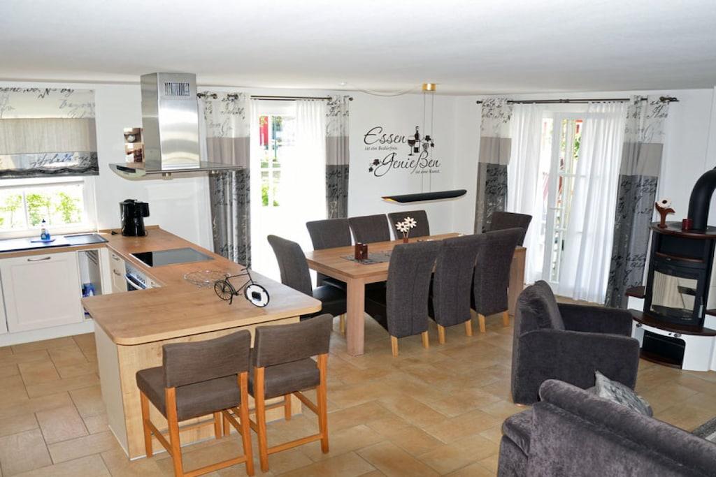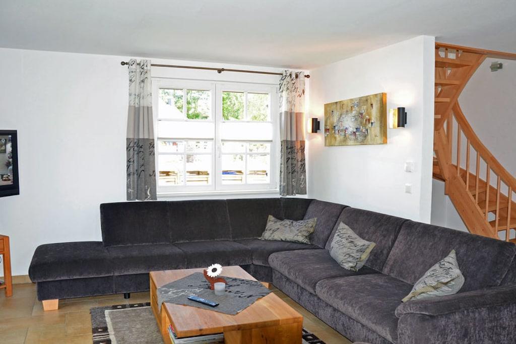 Erholungsort Glowe, über 2 Etagen, ruhige Lage, ca. 500 m zum Sandstrand (Ostsee), ca. 500 m zum Bodden Erdgeschoss: großzügiger Wohn- Essbereich mit Fußbodenheizung und Kamin, gemütliche Couchlandschaft, TV/ Sat (Flatscreen), Spielekonsole (PS3), offene komplett ausgestattete Einbauküche mit 4- Plattenherd (Ceranfeld), Backofen, Kühlschrank mit Gefrierfach, Mikrowelle, Geschirrspüler und diversen Elektrogeräten, Saunabereich mit Dusche, Gästebad mit Dusche und WC, Wirtschaftsraum mit Waschmaschine Obergeschoss: 1. & 2. Schlafzimmer mit je einem Doppelbett und großem Kleiderschrank, 3. & 4. Schlafzimmer mit je 2 Einzelbetten und großem Kleiderschrank, alle Schlafzimmer sind mit einem TV (Flatscreen) ausgestattet, modernes Bad mit Dusche und WC, Terrasse mit Gartenmöbeln, Grillmöglichkeit besteht “ein perfekter Urlaubstraum im Reethaus-Dünenwald” Reetdachgedecktes Haus, Sauna mit integrierter Wärmekabine, WLAN vorhanden, Grundstück ca. 650 qm groß, Waschmaschine ohne Gebühr, Liegewiese, 2 PKW- Stellplätze am Haus, Haustiere nicht erwünscht