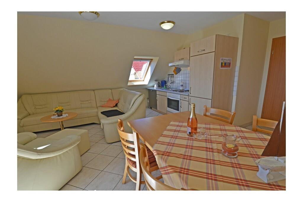 Die Ferienwohnung „Lotte“ bietet Ihnen auf ca. 78m² alles was das Herz begehrt. Die offene Wohnküche ist voll ausgestattet und grenzt an den Wohnbereich mit einer Essecke an. Drei separate Schlafzimmer stehen Ihnen zur Verfügung. Auf dem Südbalkon können Sie an sonnigen Tagen die Landschaft und die frische Seeluft genießen. Gemütlicher Wohn- & Essbereich mit bequemer Schlafcouch, Internet (WLAN), TV Digital & TV SAT/Kabel, Radio, die offene Wohnküche bietet Backofen, Kühlschrank mit kleinem Gefrierfach, Geschirrspüler, Mikrowelle und diverse Elektrogeräte, 1. Schlafzimmer mit Doppelbett (180 x 200) und Kleiderschrank, 2. & 3. Schlafzimmer mit je zwei Einzelbetten (90 x 200), Badezimmer mit Dusche und WC, Föhn Besonderes: An den Boddenwiesen- ruhig, idyllisch und familienfreundlich Die Ferienwohnung verfügt über einen Balkon. Das gemeinschaftlich genutzte Grundstück ist umzäunt. Sehr kinderfreundliche Einrichtung mit Kinderspielen, der Tischkicker bietet Spaß für Groß und Klein. Kinderbett, Kinderhochstuhl und Treppenschutzgitter sind vorhanden. Waschmaschine vorhanden (ohne Gebühr). Kostenfreies W-LAN ist ebenfalls verfügbar. Das Quartier bietet 2 PKW-Stellplätze und einen Fahrradständer (offen). Ein Schuppen bietet Platz für maximal 2 Fahrräder oder ein Kinderwagen. Ein Reiterhof ist in unmittelbarer Nähe. Der Spielplatz ist ca. 8 min Fußweg entfernt. Einkaufsmöglichkeiten, Bäcker und Restaurant befinden sich in unmittelbarer Nähe, optimale Anbindung an Radwanderwege. Genießen Sie vom Balkon den Blick über die Boddenwiesen bis hin zum Großen Jasmunder Bodden. Als Highlight des Abends (gegen 22.30 Uhr) können Sie das Feuerwerk der Störtebeker Festspiele bestaunen. Haustiere sind nicht erwünscht.