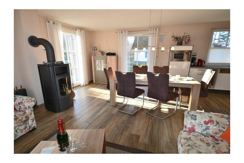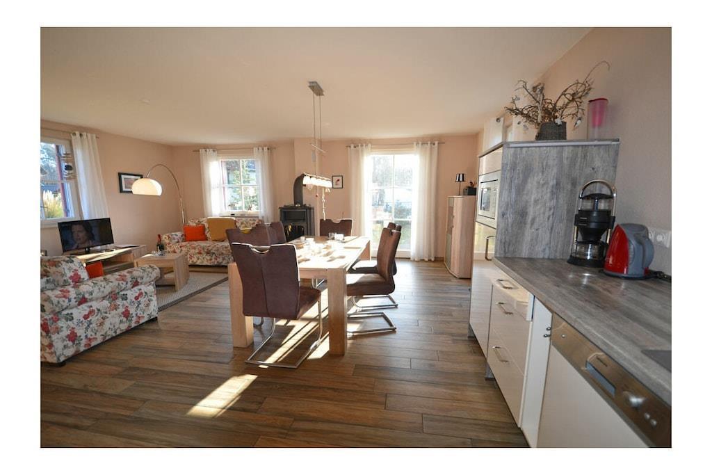 Erdgeschoss: großzügiger Wohn- Essbereich mit Kamin und Fußbodenheizung, gemütliche Couchlandschaft und Sessel, TV-Sat (OLED Fernseher), CD-Player/DVD-Player, WLAN vorhanden, offene komplett ausgestattete hochwertige Einbauküche mit 4-Plattenherd (Ceran), Backofen, Kühlschrank mit kleinem Gefrierfach, Geschirrspüler und diversen Elektrogeräten (Mikrowelle, Kaffeemaschine, Toaster, Wasserkocher etc.), Badezimmer mit WC und ebenerdiger Dusche, Wellnessbereich mit Sauna, Hauswirtschaftsraum mit Waschmaschine, Wäscheständer und Staubsauger; Flur mit Garderobe und Spiegel Obergeschoss: 1. Schlafzimmer mit einem Doppelbett (getrennte Matratzen je 90 × 200cm), Kleiderschrank und TV 2. Schlafzimmer mit einem Doppelbett (durchgehende Matratze 160×200cm), einem Einzelbett (90x200cm) mit Ausziehfunktion (80cm x 200cm) und Kleiderschrank, großes Badezimmer mit Badewanne, Dusche, separates WC, Kosmetikspiegel und Handtuchhalter Außenbereich: Terrasse mit gemütlichen Gartenmöbeln, ein Strandkorb lädt zum Relaxen ein, Grillmöglichkeit besteht (Grill vorhanden), große Liegewiese und Bollerwagen “Unter Reet einen perfekten Urlaubstraum erleben” Zwischen den Halbinseln Jasmund und Wittow, im Norden Rügens, liegt das einstige Fischerdorf Glowe. Mittendrin liegt unser Ferienhaus „Strandläufer“. Das Grundstück umfasst ganze 600qm und bietet richtig viel Platz mit einer großen Liege/ – Spielwiese und einer großen Terrasse. Auf der Terrasse finden Sie schöne Holzgartenmöbel und einen Steingrill. Hier entsteht Urlaubsatmosphäre pur! Unser „Strandläufer“ ist ein Nichtraucherhaus. Internet (WLAN) sowie die Waschmaschine stehen Ihnen zur kostenlosen Nutzung zur Verfügung. Damit Ihre Kleinen bei der Treppe nicht zu Schaden kommen, gibt es ein Kinderschutz-Treppengitter, was gerne genutzt werden kann. Fußbodenheizung gibt es im ganzen Haus. Alle Schlafzimmer sind mit Insektenschutz ausgestattet, damit die Mücken nicht zur Plage werden. Die Lage der gemütlichen und ruhig gelegenen Reethaus Siedlung am Ortsausgang von Glowe bietet eine perfekte Strandlage, ist aber auch Ausgangspunkt für ausgedehnte Spaziergänge und Fahrradtouren mit dem Bodden im Hinterland und Schloss Spyker. Für Ihre Fahrräder steht Ihnen ein abschließbares Gartenhaus als Unterstellmöglichkeit zur Verfügung. Zu den Einkaufsmöglichkeiten, Restaurants, Cafés, Fischräuchereien, zum Fahrradverleih und zur 9km langen Strandpromenade (Schaabe) sind es nur wenige Gehminuten. Direkt am Haus gibt es für Sie und Ihrer Familie 2 PKW-Stellplätze zur alleinigen Nutzung. Ein Haustier ist nach Absprache Herzlich Willkommen! (Gebühr Euro 10,- / Nacht). Weitere Haustiere nach Rücksprache.