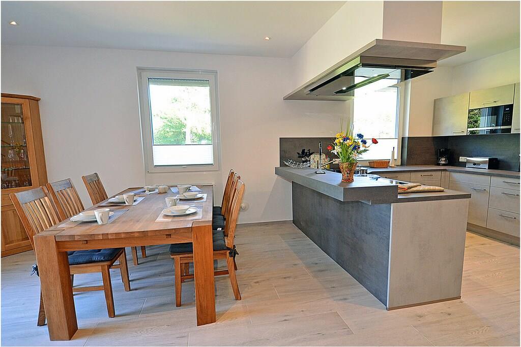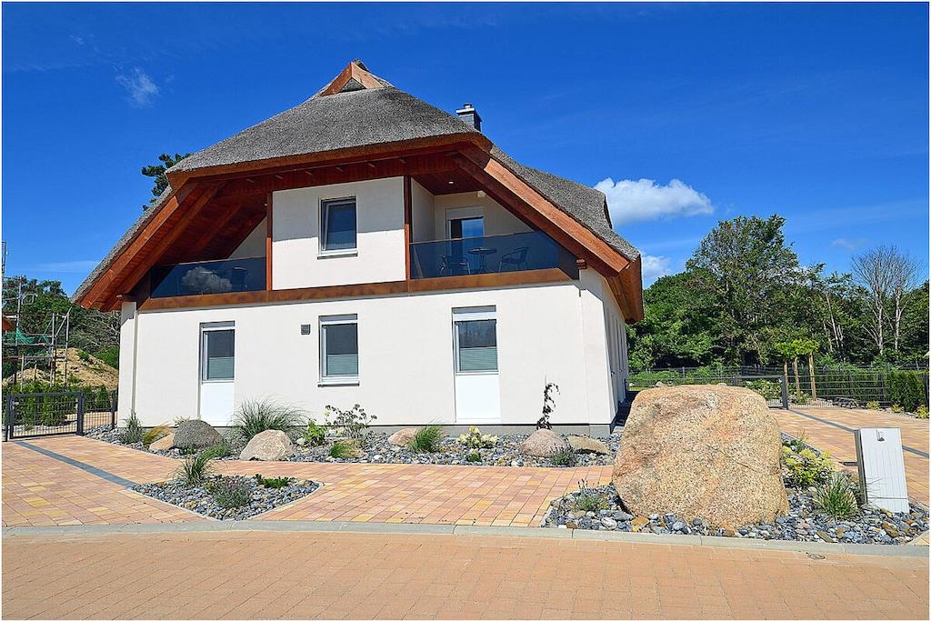 Erdgeschoss: modern und elegant eingerichteter Wohnbereich mit gemütlicher Couchlandschaft und Sessel, der Kamin spendet Wohlfühlatmosphäre an kalten Tagen, TV Sat/Kabel (Flatscreen), Radio, komplett ausgestattete hochwertige Einbauküche mit Kochinsel, großer Esstisch für 6 Personen, 4-Plattenherd (Induktionsherd), Backofen, Kühlschrank mit einem kleinem Gefrierfach, Geschirrspüler, Mikrowelle und diversen Elektrogeräten, 1. Schlafzimmer mit einem Einzelbett (100 x 200) mit Kleiderschrank und Schreibtisch, 1. großes Bad mit ebenerdiger Dusche, Badewanne, WC und Föhn Obergeschoss: 2. Schlafzimmer mit Zugang zum Balkon, Doppelbett (zwei getrennte Matratzen je 80 x 200) und Kleiderschrank mit Schreibtisch, 3. Schlafzimmer mit Zugang zum Balkon, Doppelbett (zwei getrennte Matratzen je 80 x 200), ein Einzelbett (90 x 200 ) und Kleiderschrank mit Schreibtisch, 2. Badezimmer mit ebenerdiger Dusche, WC und Föhn, Souterrain: Waschmaschine, Bügelbrett und Bügeleisen, Wäscheständer Außenbereich: gepflegtes Grundstück, Terrasse mit bequemen Gartenmöbeln (6 Gartenstühle), Grillmöglichkeit besteht (Grill vorhanden), Fahrradständer Zeit für Erholung! – Genießen Sie traumhafte Urlaubstage – Erstvermietung seit dem 01.08.2020 Das schöne neuerbaute Reetgedeckte Doppelhaus „Kliffrand“ ist modern und mit viel Liebe zum Detail eingerichtet. Das gepflegte Grundstück mit Liegewiese ist komplett umzäunt und lädt zum Entspannen ein. Internet (WLAN) steht Ihnen kostenfrei zur Verfügung. Wohnzimmer, Küche und die Bäder haben Fußbodenheizung. Alle anderen Räume haben Heizkörper. Die Fenster sind mit elektrischen Außenjalousien und teilweise mit Insektenschutz ausgestattet. Das Ferienhaus „Kliffrand“ ist ein Nichtraucherquartier. Am Objekt befinden sich 2 PKW-Stellplätze und eine Abstellmöglichkeiten für Fahrräder. Haustiere sind nicht erwünscht.