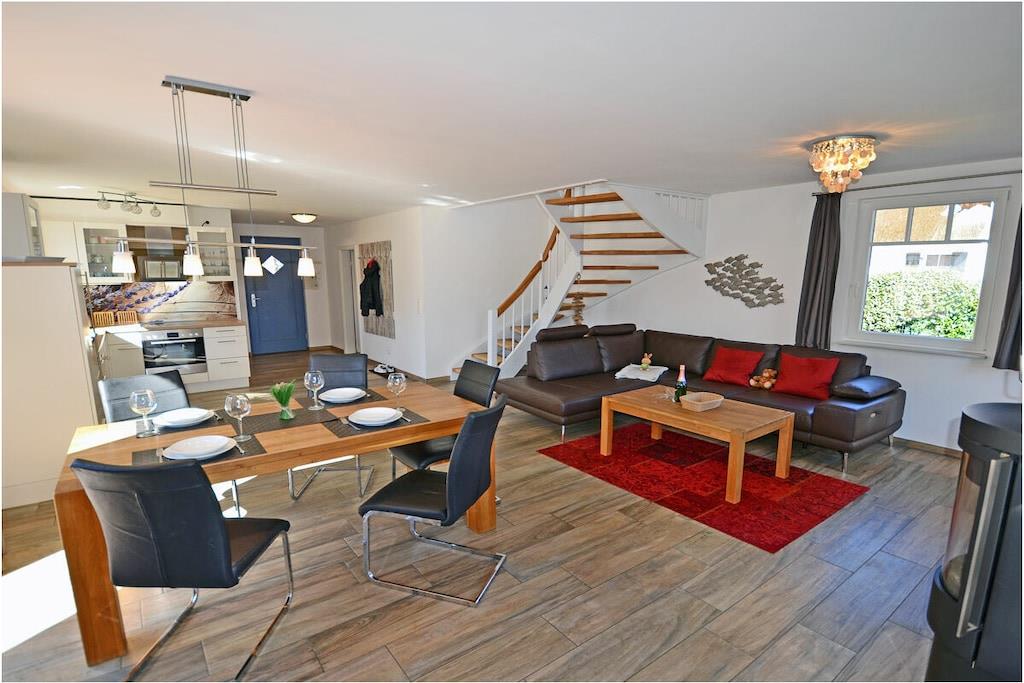 Erholungsort Glowe, über 2 Etagen, ruhige Lage, ca. 250m zum Sandstrand (Ostsee), ca. 500m zum Bodden Erdgeschoss: großzügiger Wohn- Essbereich mit Fußbodenheizung und Kamin, gemütliche Couchlandschaft mit Schlaffunktion für eine Person, TV/ Sat (Flatscreen), Blu-ray Player, DVD-Player, Radio/CD, offene komplett ausgestattete Einbauküche mit 4- Plattenherd (Ceranfeld), Backofen, Kühlschrank mit kleinem Gefrierfach, Geschirrspüler und diversen Elektrogeräten, 1. Bad mit Dusche und WC, Obergeschoss: 1. Schlafzimmer mit Doppelbett (180x200) und Kleiderschrank, 2. Schlafzimmer mit zwei Einzelbetten und Kleiderschrank, Insektengitter in den Schlafräumen vorhanden, 2. Bad mit Badewanne und WC, Terrasse mit Gartenmöbeln, 1 Strandkorb und Sonnenschirm, Grill vorhanden “unter Reet einen perfekten Urlaubstraum erleben” Reetdachgedecktes Haus, Grundstück ca. 450qm, Nichtraucher, Waschmaschine vorhanden, Liegewiese, Fahrradabstellmöglichkeit (Gartenhaus), 1 PKW- Stellplatz am Haus, Kinderschutzgitter im OG, Kinderbett, Kinderhochstuhl sowie Bollerwagen vorhanden, Einkaufsmöglichkeiten, Bäcker und Restaurant in unmittelbarer Nähe, optimale Rad- und Wandermöglichkeiten