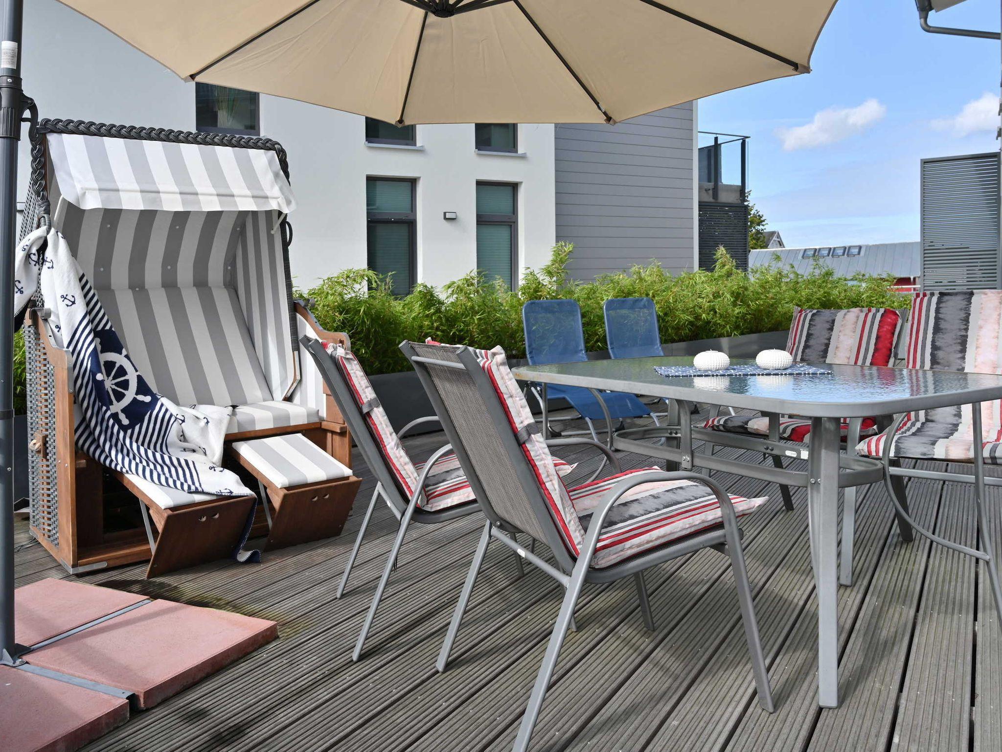 Der Wohnbereich grenzt an einen Balkon wie an eine großzügige Dachterrasse mit Strandkorb, Sonnenliegen und anderen Gartenmöbeln.