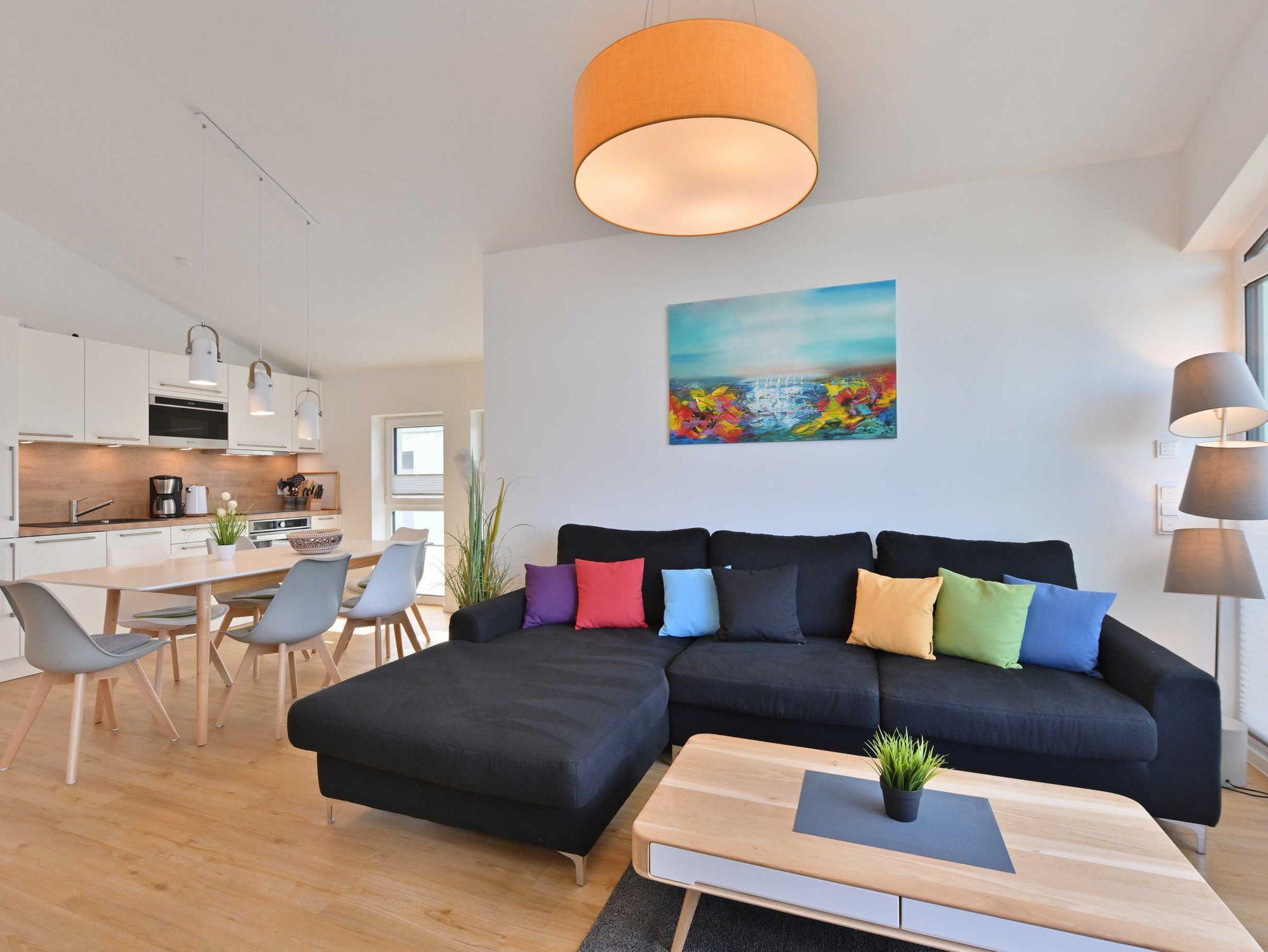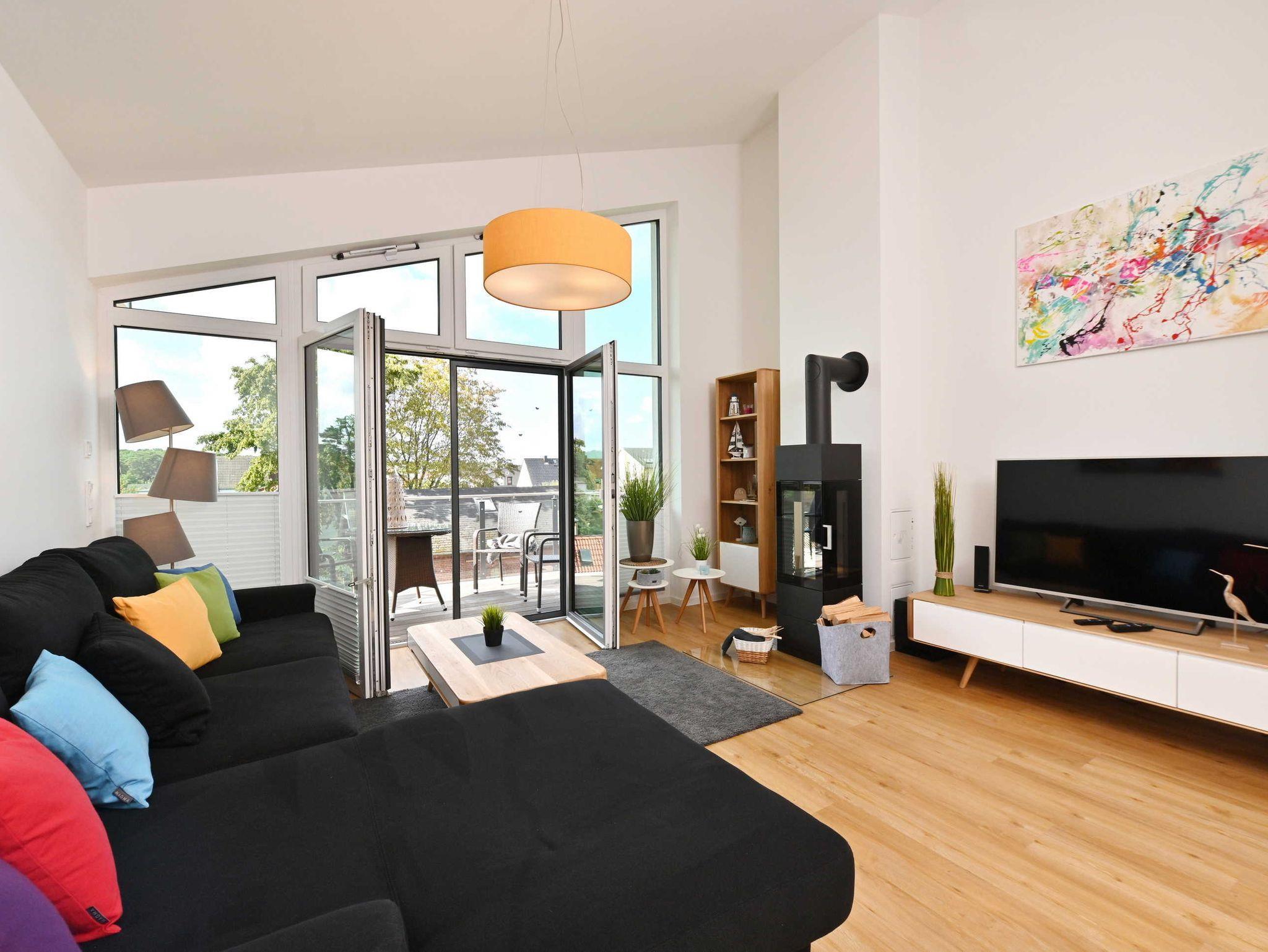 Die Wohnung bietet auf 80qm einen gemütlichen Wohnraum mit Kamin und integrierter Küche, zwei Schlafräume mit je einem Doppelbett (180x200m bzw. 160x200) und ein Bad mit Dusche. Der Nordbalkon ist aus dem Wohnbereich zu erreichen, der Südbalkon aus einem Schlafzimmer.