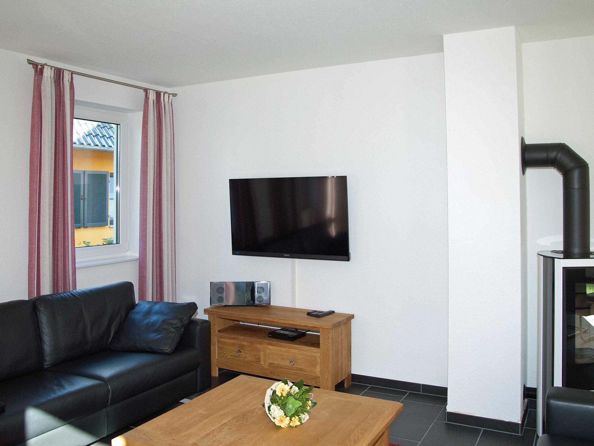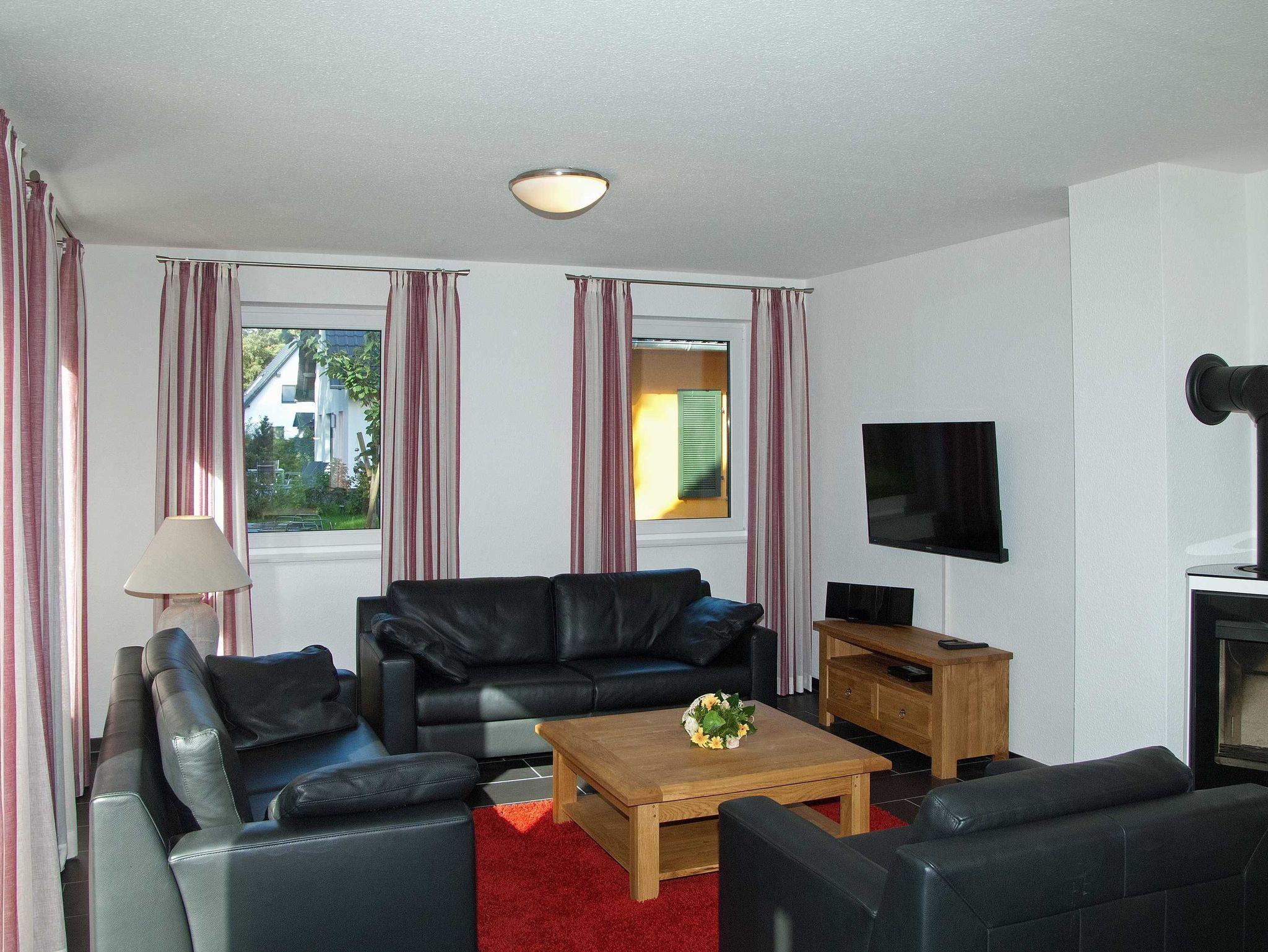 Im Wohnbereich werden Sie sich auch mal bei schlechtem Wetter sehr wohlfühlen. Die Einrichtung mit massiven Eichenmöbeln ist auf den gemütlichen Stil des Hauses mit dem Reetdach abgestimmt. Zum Entspannen finden Sie dort eine riesige Sofaecke aus feinstem Leder. Wenn dann das Kaminfeuer flackert, erlebt man bestimmt romantische Abende. Sollten Sie mit Kindern die Ferien geniessen, so werden Sie auch die Entertainmentaustattung mit Flachbildschirm und hunderten Programmen schätzen. Auch die Stereoanlage können Sie gern richtig aufdrehen, denn durch die massive Bauweise kann Sie garantiert kein Nachbar hören.