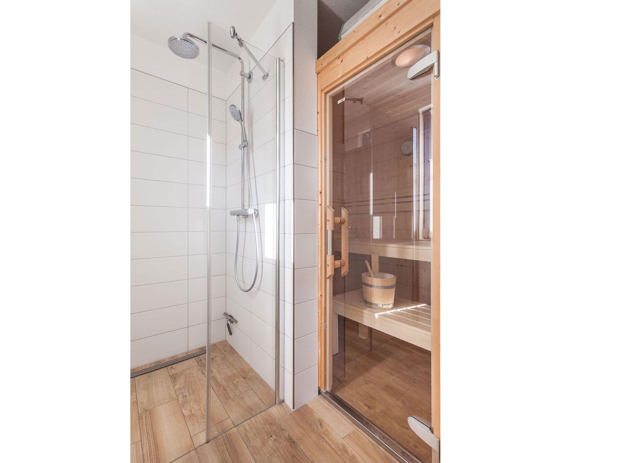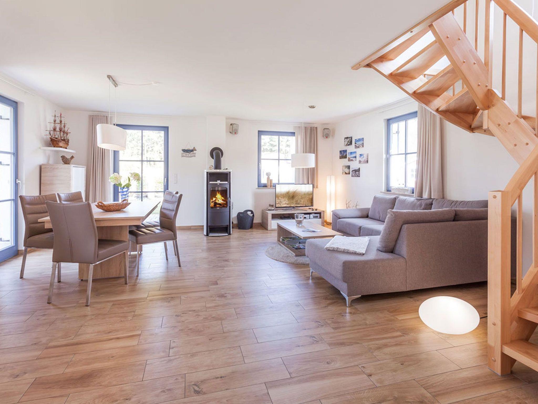 Erdgeschoss: großzügiger Wohn- Essbereich mit Fußbodenheizung (im gesamten Haus) und Kamin, gemütliche Couchlandschaft, TV/Sat (Flatscreen), Blu-ray-Player und DVD-Player, Radio/CD, offene komplett ausgestattete Einbauküche mit 4-Plattenherd (Ceranfeld), Backofen, großer Kühlschrank mit großem Gefrierfach, Geschirrspüler und diversen Elektrogeräten, Saunabereich mit Dusche und separatem WC