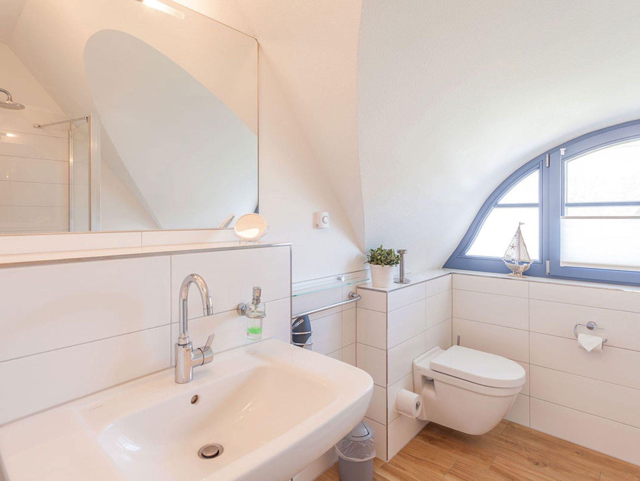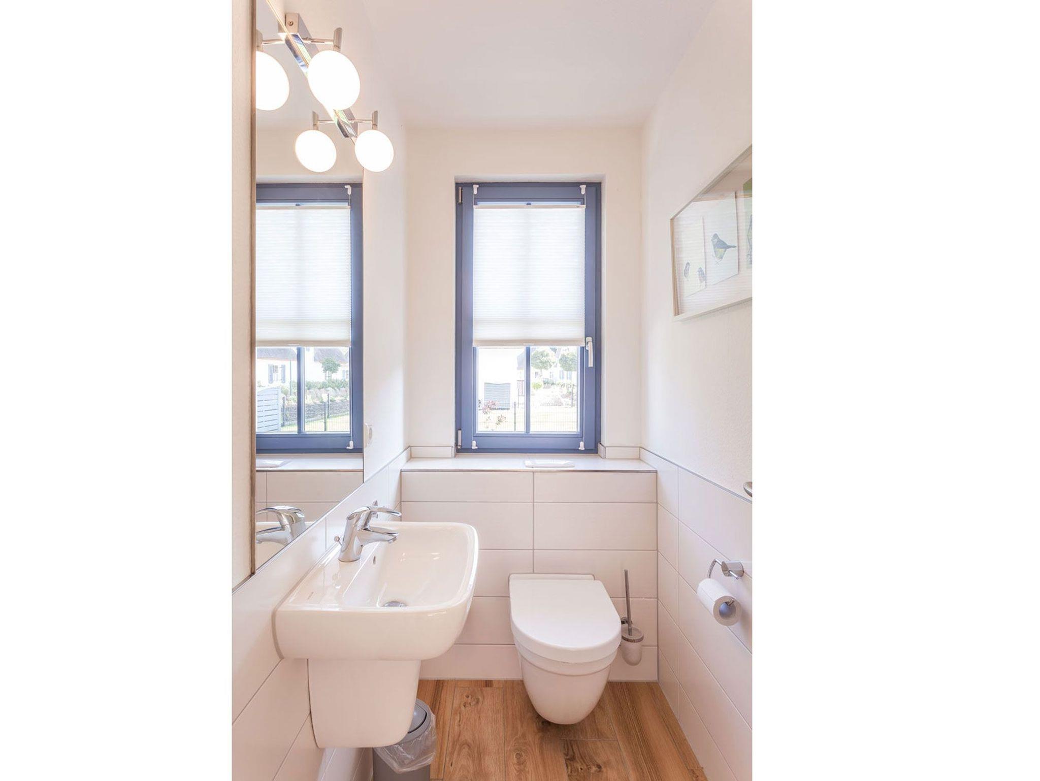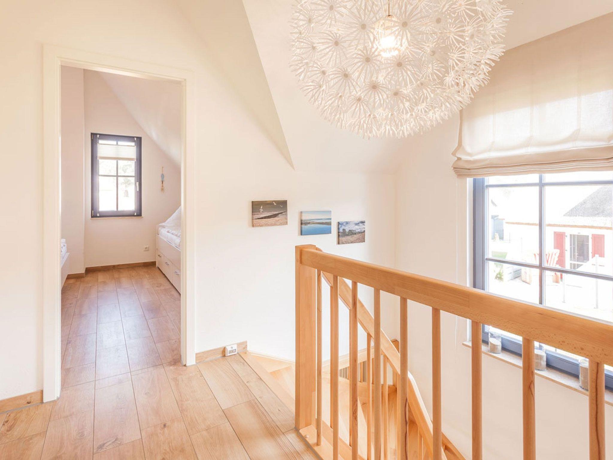 Obergeschoss: 1. Schlafzimmer mit einem Doppelbett, TV/Sat (Flatscreen) und Kleiderschrank, 2. Schlafzimmer mit Doppelbett und einem Einzelbett und Kleiderschrank, hochwertiges Bad mit Badewanne, Dusche und WC, Fön vorhanden, Terrasse mit Gartenmöbeln, abschließbare Gartenhütte (z.B. für Ihre privaten Fahrräder, Surfbrett, Bollerwagen etc.), Grill ist vorhanden