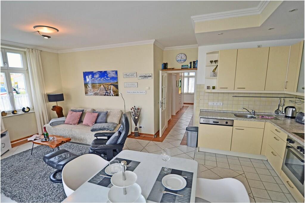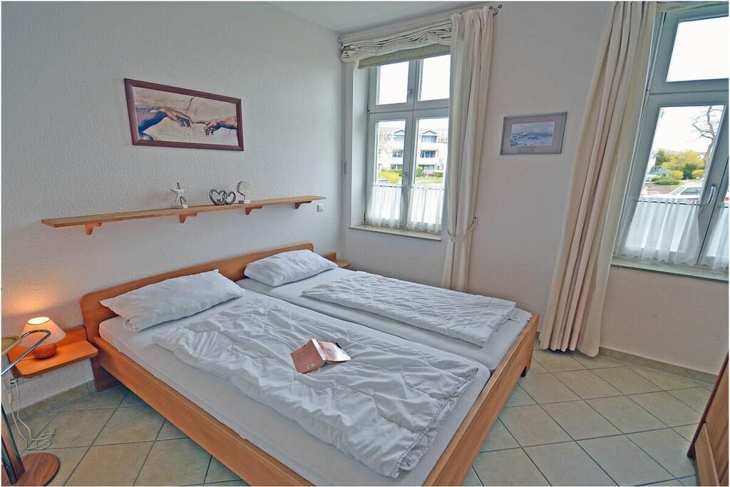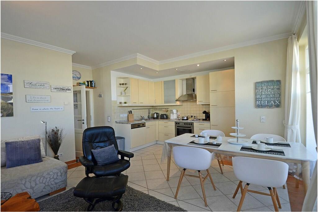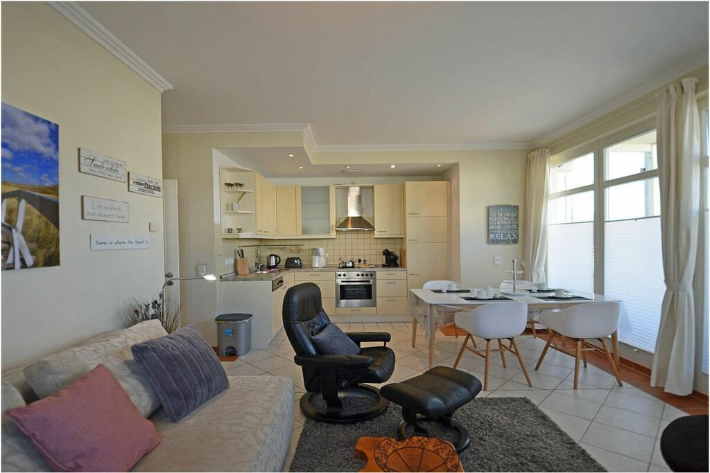 Hochparterre: großzügiger Wohn- Essbereich, gemütliche Ausziehcouch mit Schlaffunktion, OLED-TV mit besonderer Schärfe und Kontrast , Bluray´s/ DVD`s, Radio/CD, kostenfreies Internet (WLAN), Fußbodenheizung in allen Räumen, Bücher und Gesellschaftsspiele für gemütliche Abende, Fliegenschutzgitter im Wohnzimmer und in den Schlafräumen, komplett ausgestattete Einbauküche mit hochwertigen Geräten, 4- Plattenherd (Ceranfeld), Backofen, Kühlschrank mit Gefrierfach, Geschirrspüler und diversen Elektrogeräten, modernes Bad mit Dusche, WC und Föhn, 1. Schlafzimmer mit Doppelbett (2 Matratzen je 90×200) und Kleiderschrank und TV/ Sat (Smart-TV) 2. Schlafzimmer mit 1 Tandembett (Einzelbett mit Ausziehfunktion je 90×200) und Kleiderschrank Außenanlage: Grillmöglichkeit besteht (Gemeinschaftsgrillplatz)