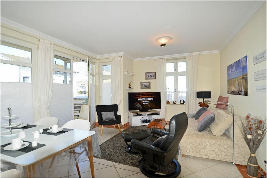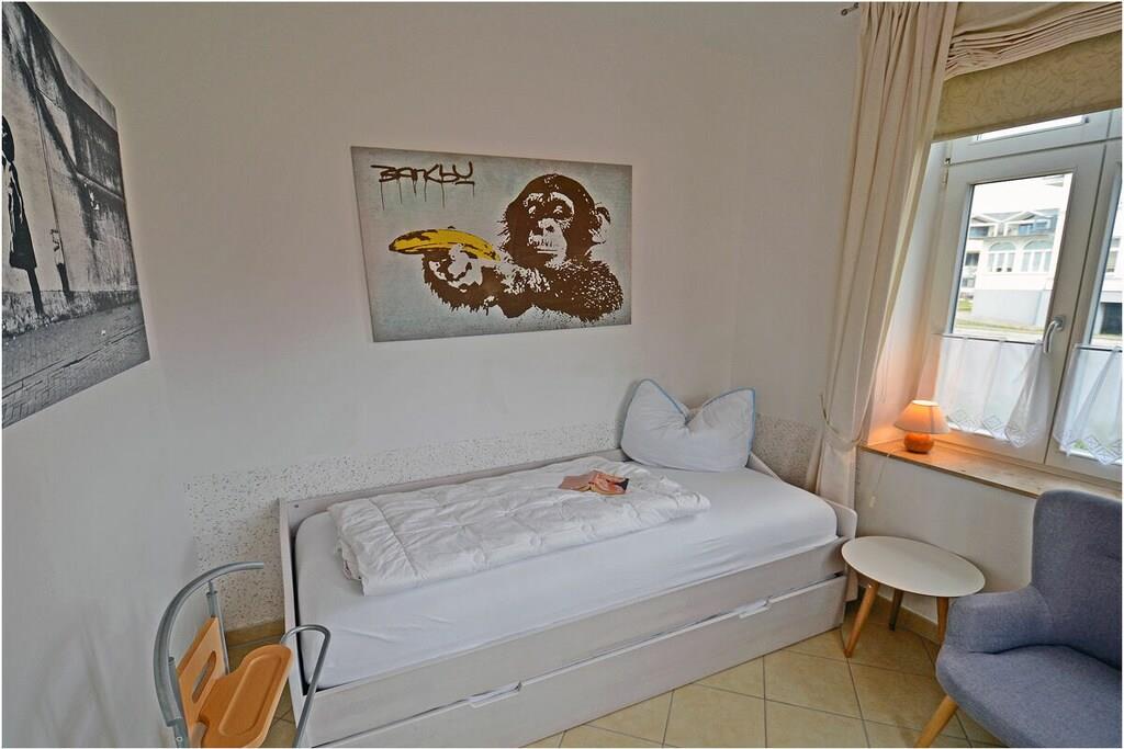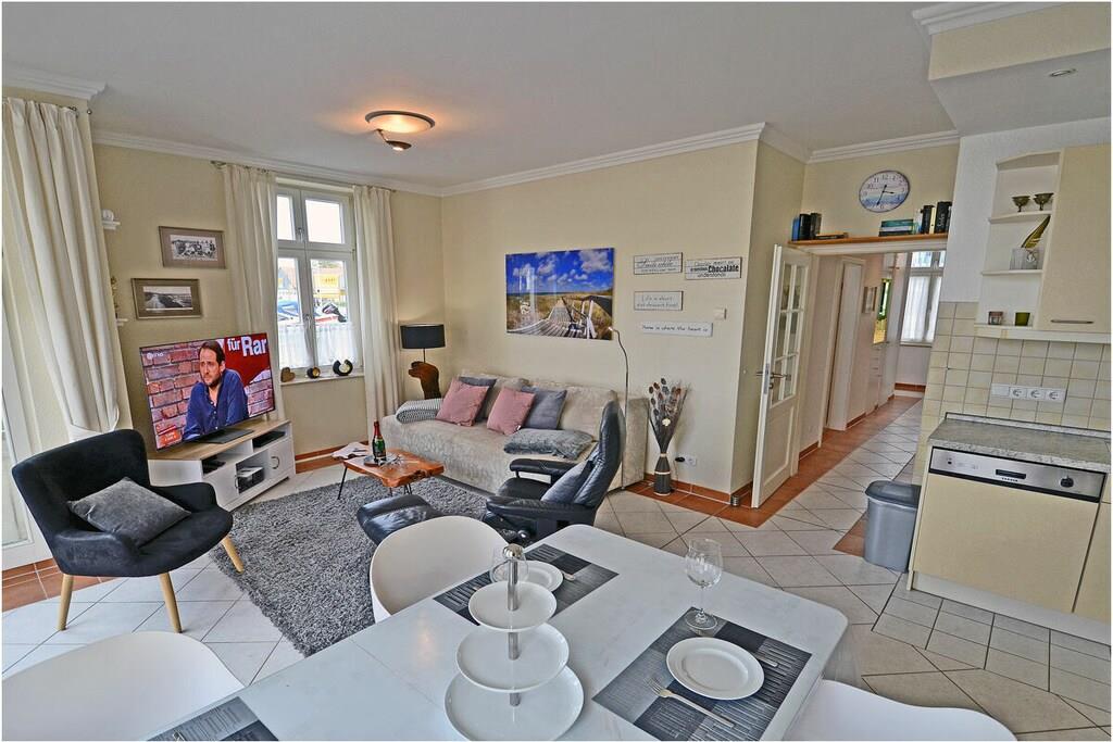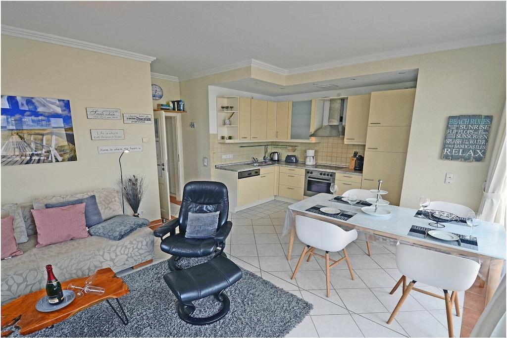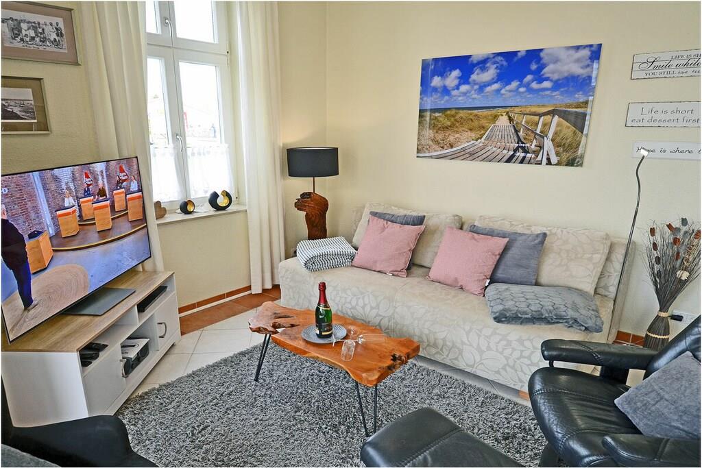 Hochparterre: großzügiger Wohn- Essbereich, gemütliche Ausziehcouch mit Schlaffunktion, OLED-TV mit besonderer Schärfe und Kontrast , Bluray´s/ DVD`s, Radio/CD, kostenfreies Internet (WLAN), Fußbodenheizung in allen Räumen, Bücher und Gesellschaftsspiele für gemütliche Abende, Fliegenschutzgitter im Wohnzimmer und in den Schlafräumen, komplett ausgestattete Einbauküche mit hochwertigen Geräten, 4- Plattenherd (Ceranfeld), Backofen, Kühlschrank mit Gefrierfach, Geschirrspüler und diversen Elektrogeräten, modernes Bad mit Dusche, WC und Föhn, 1. Schlafzimmer mit Doppelbett (2 Matratzen je 90×200) und Kleiderschrank und TV/ Sat (Smart-TV) 2. Schlafzimmer mit 1 Tandembett (Einzelbett mit Ausziehfunktion je 90×200) und Kleiderschrank Außenanlage: Grillmöglichkeit besteht (Gemeinschaftsgrillplatz)