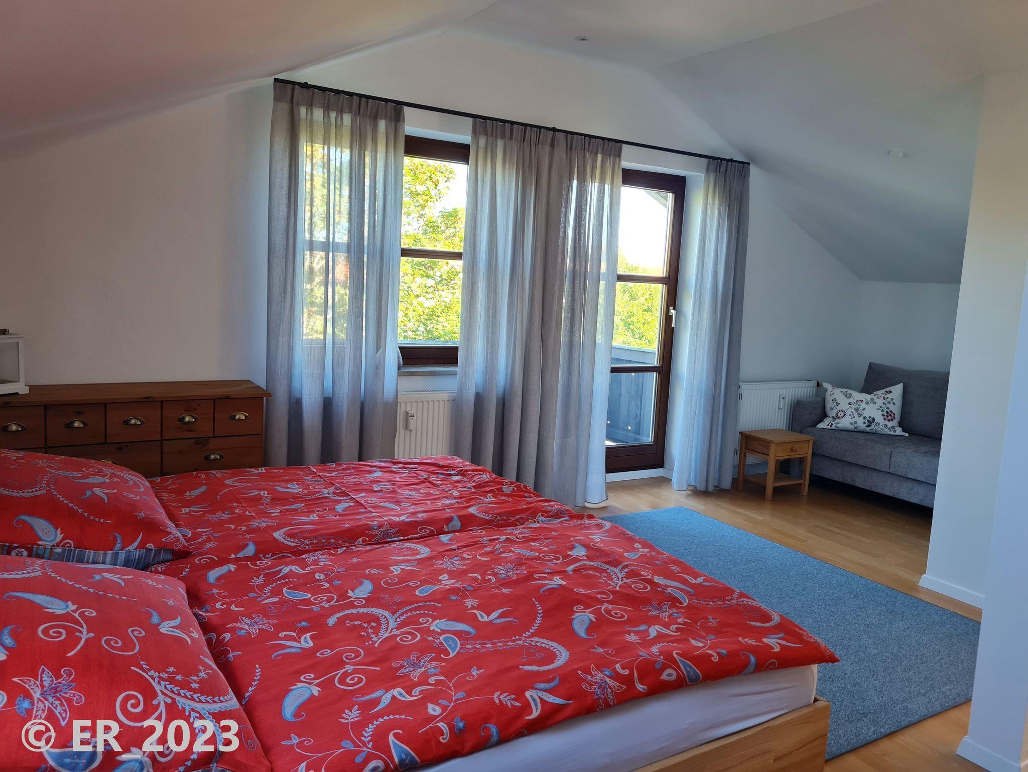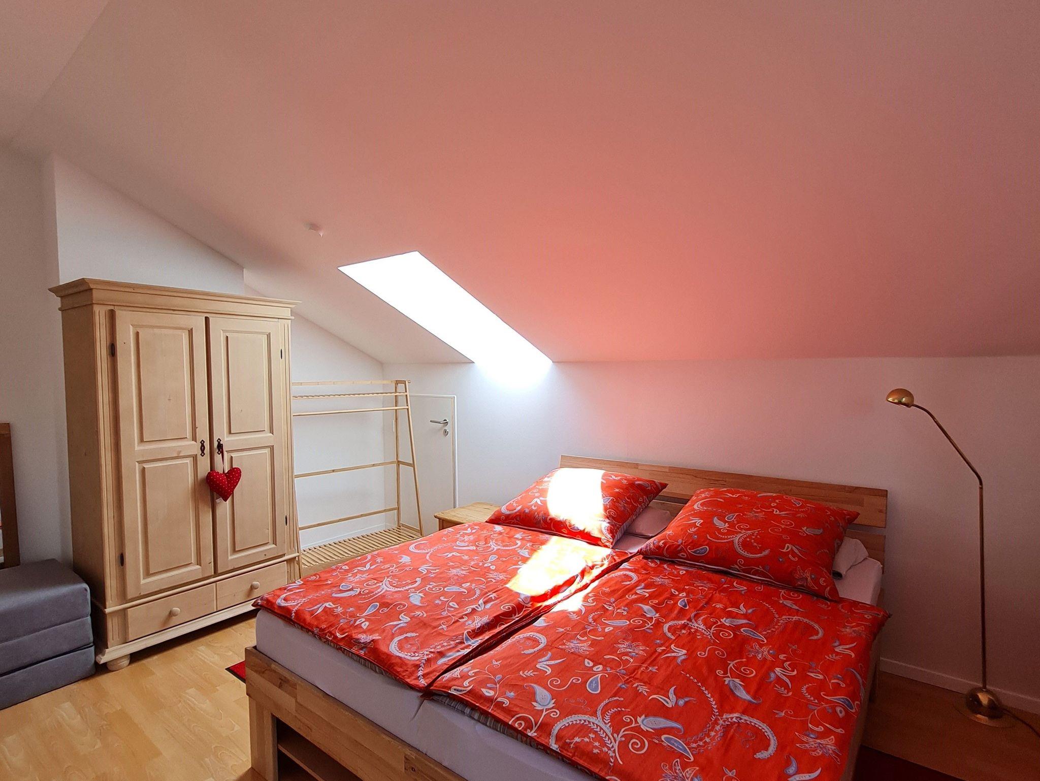 Im Schlafzimmer gibt es eine vollwertige Schlafcouch und ein großes Doppelbett.