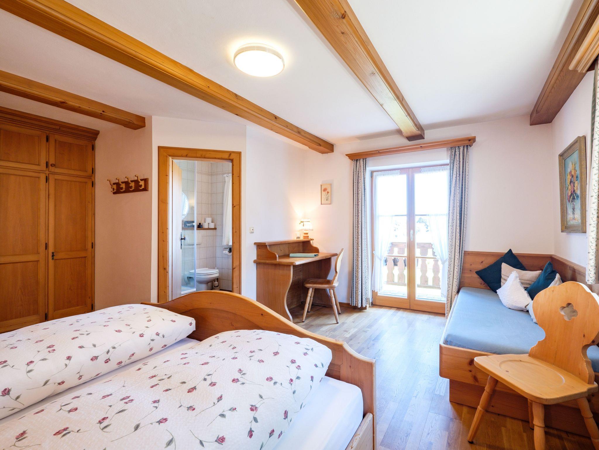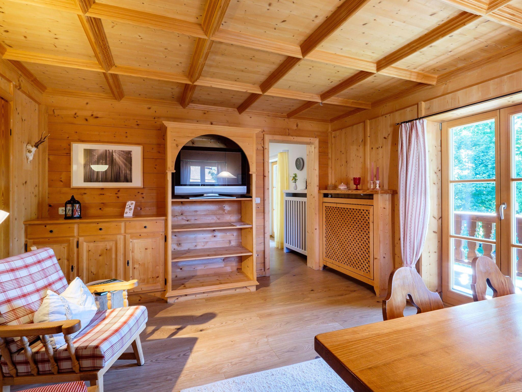 Die konfortabel und gemütlich eingerichtete ****Wohnung hat 2 Balkone mit Sicht auf die umliegenden Wiesen und Berge. In dieser ruhig gelegenen Wohnung können Sie die Sonne vom frühen Morgen bis zum Nachmittag genießen. Der Südbalkon ist überdacht und so geschützt, dass Sie auch an Regentagen die frische Luft und die Ruhe genießen können. Die Wohnung verfügt über ein Schlafzimmer mit Doppelbett und ein festes Zusatzbett, ein Kinderbett kann außerdem zugestellt werden. Das Wohnzimmer ist sehr geräumig und im ländlichen Stil mit großer Essecke und Couch (evtl. Schlafcouch) möbiliert und verbreitet bayrische Gemütlichkeit. In der gut ausgestatteten Küche, erneuert 2023, lädt ein Bistrotisch zum Brotzeitmachen ein.