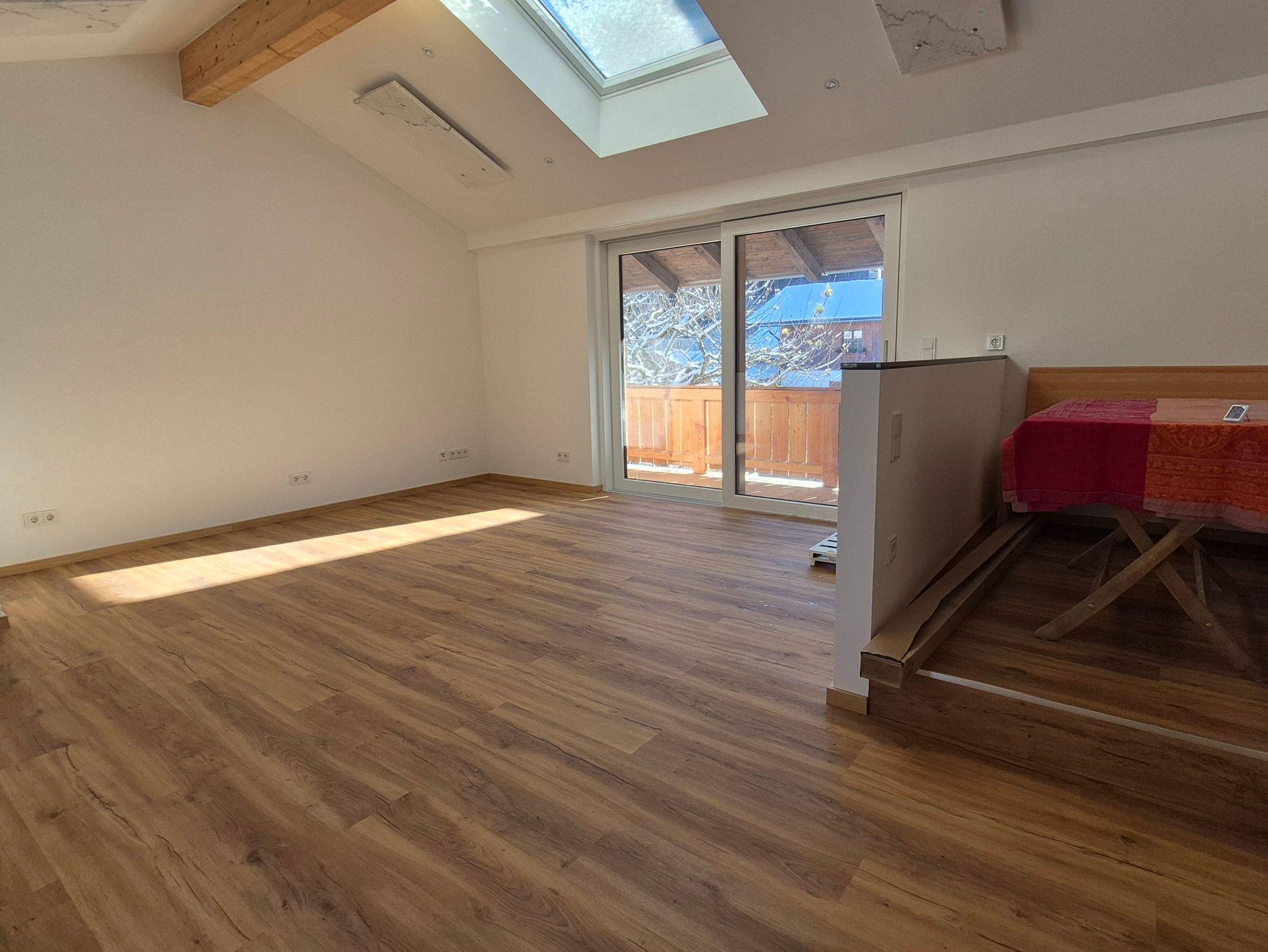 Die Ferienwohnung Holzeralmblick klein ist nagelneu renoviert und modern warm mit Holzböden und Holzmöbeln eingerichtet. Der nach Süden gerichtete Balkon ermöglicht ein Frühstück in der Sonne. Die obere Etage besticht durch ihre Geräumigkeit und Helligkeit. Das vorhandene Schlafsofa ermöglicht es, wenn notwendig, weitere Personen unterzubringen.