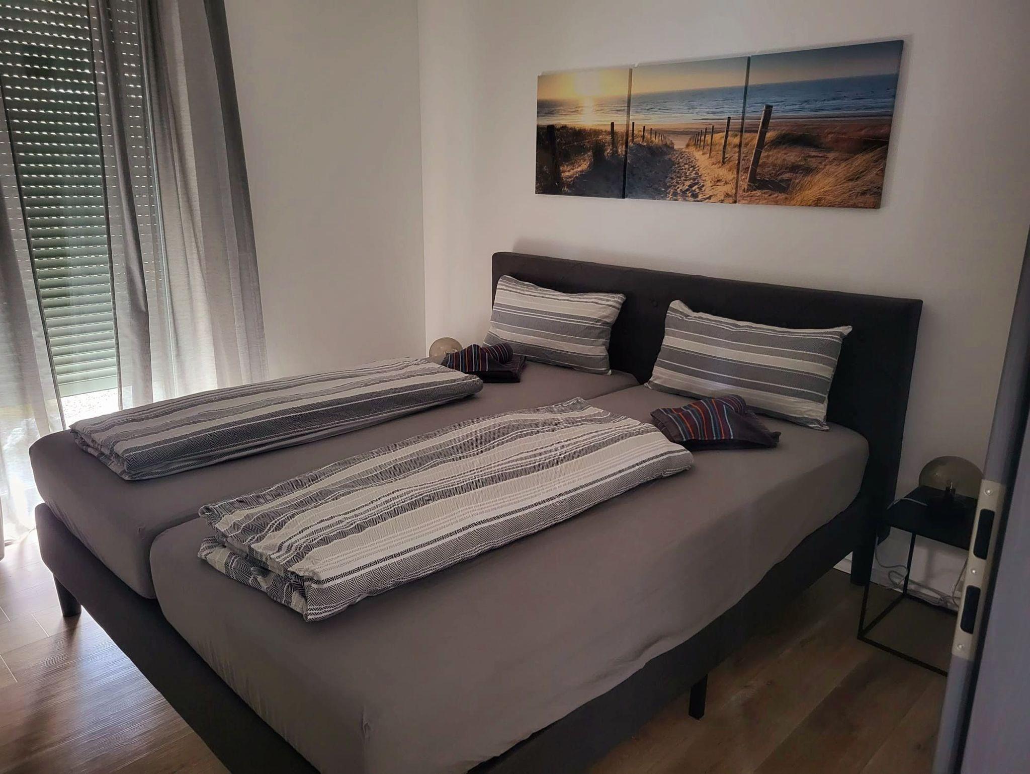- 1x Schlafzimmer unten mit Doppelbett 180x200, Flachbildfernseher, eine Kommode und zwei Kleiderständern