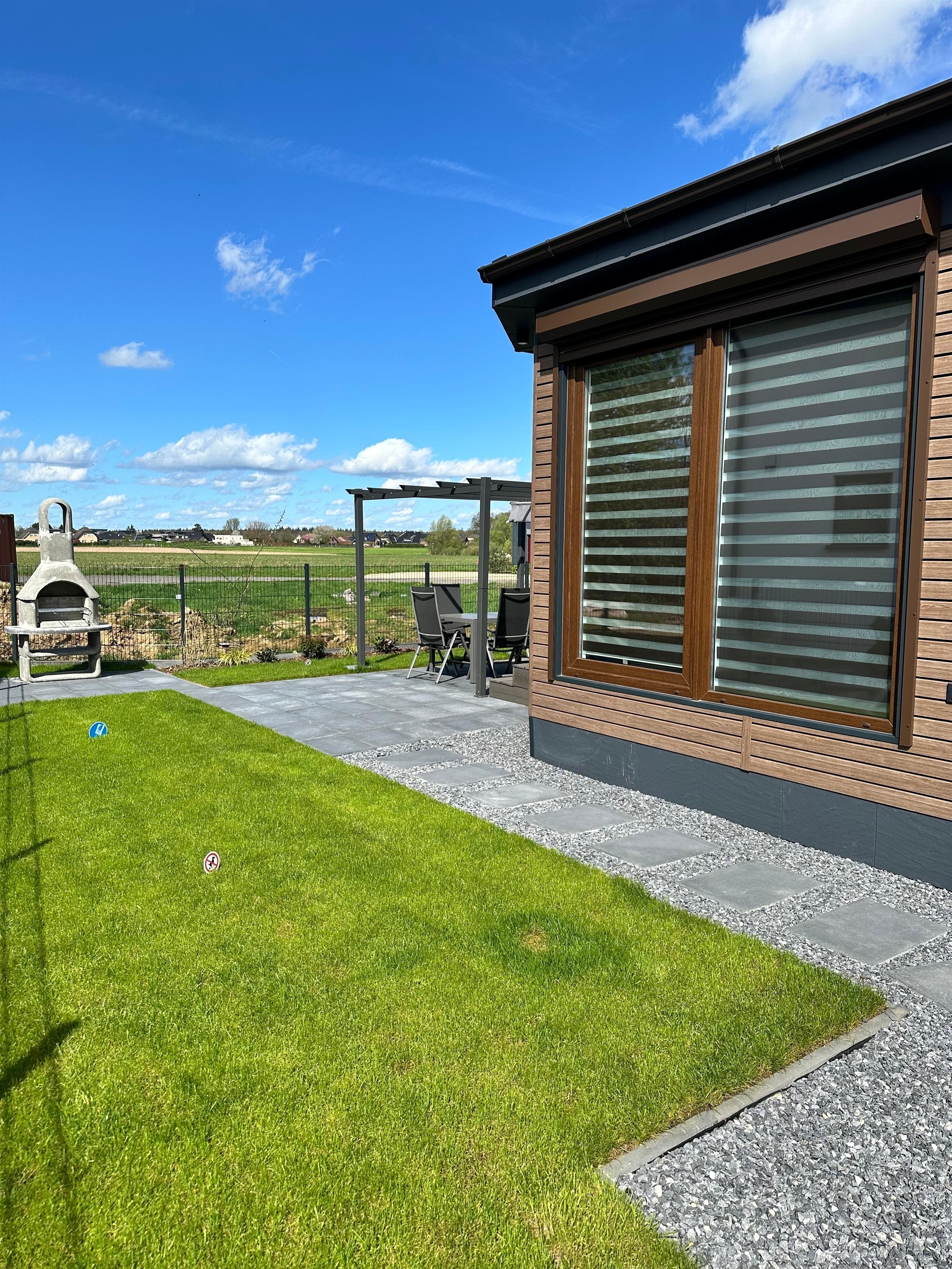 Auf dem umzäunten Grundstück befinden sich zwei PKW-Stellplätze, ein Gartenhaus, Terrasse mit Grillplatz und Rasenfläche mit Gartenhaus.