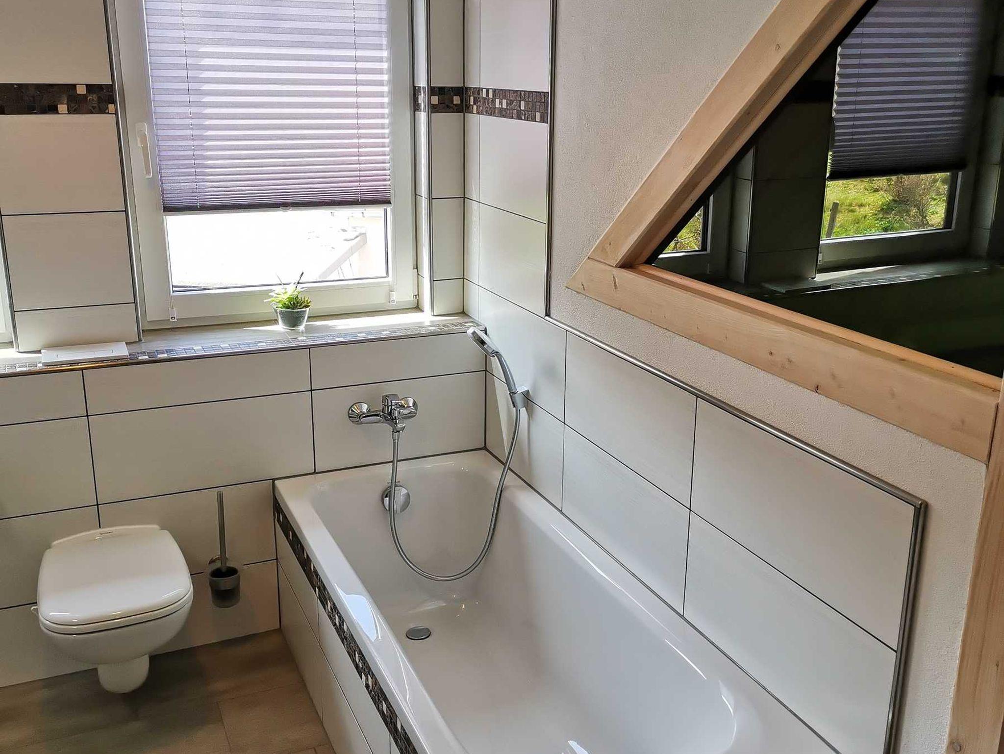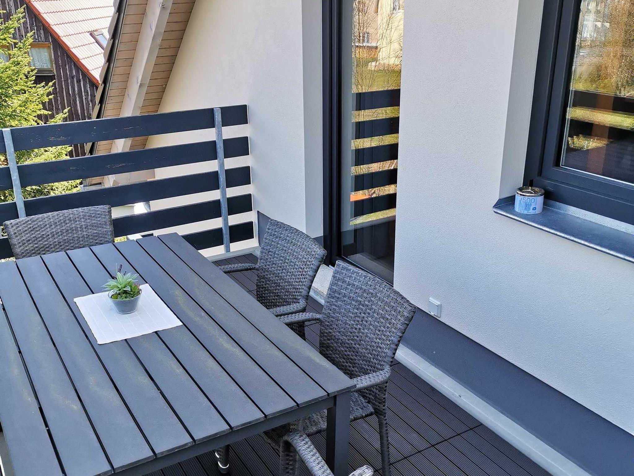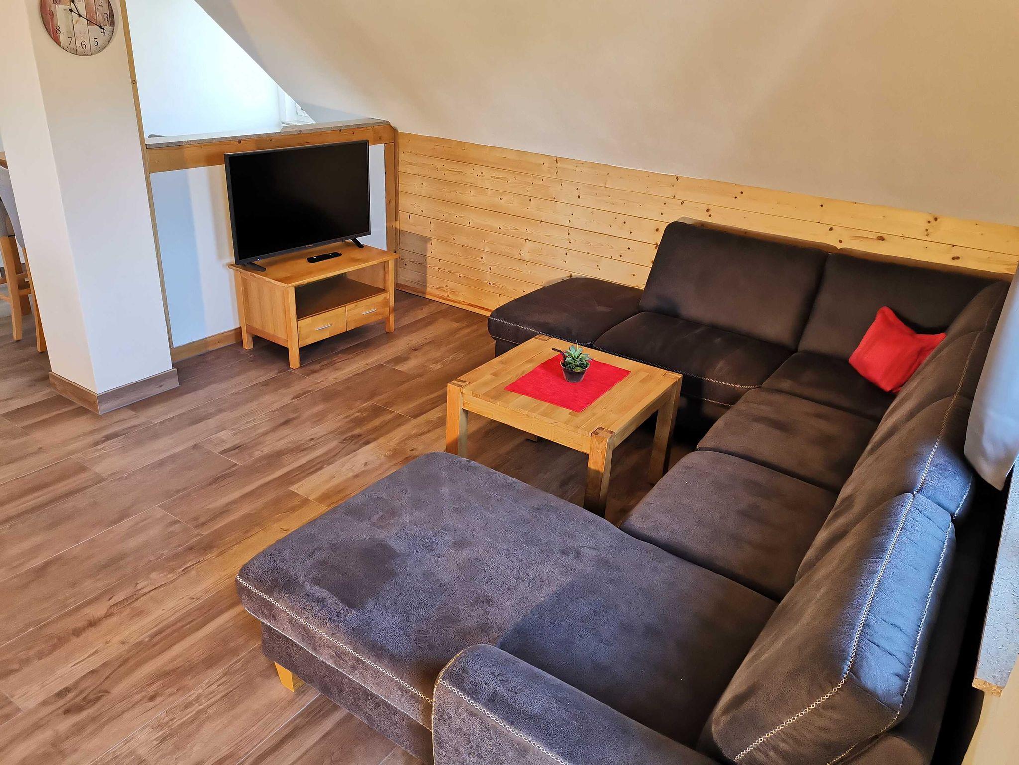 Das Ferienapartment im Dachgeschoss für bis zu 7 Personen verfügt über 3 Schlafzimmer mit Fernseher, 2 Bäder 1 Sauna und eine große Wohnküche und Fußbodenheizung. Von der Küche aus gelangen Sie direkt auf den Balkon.