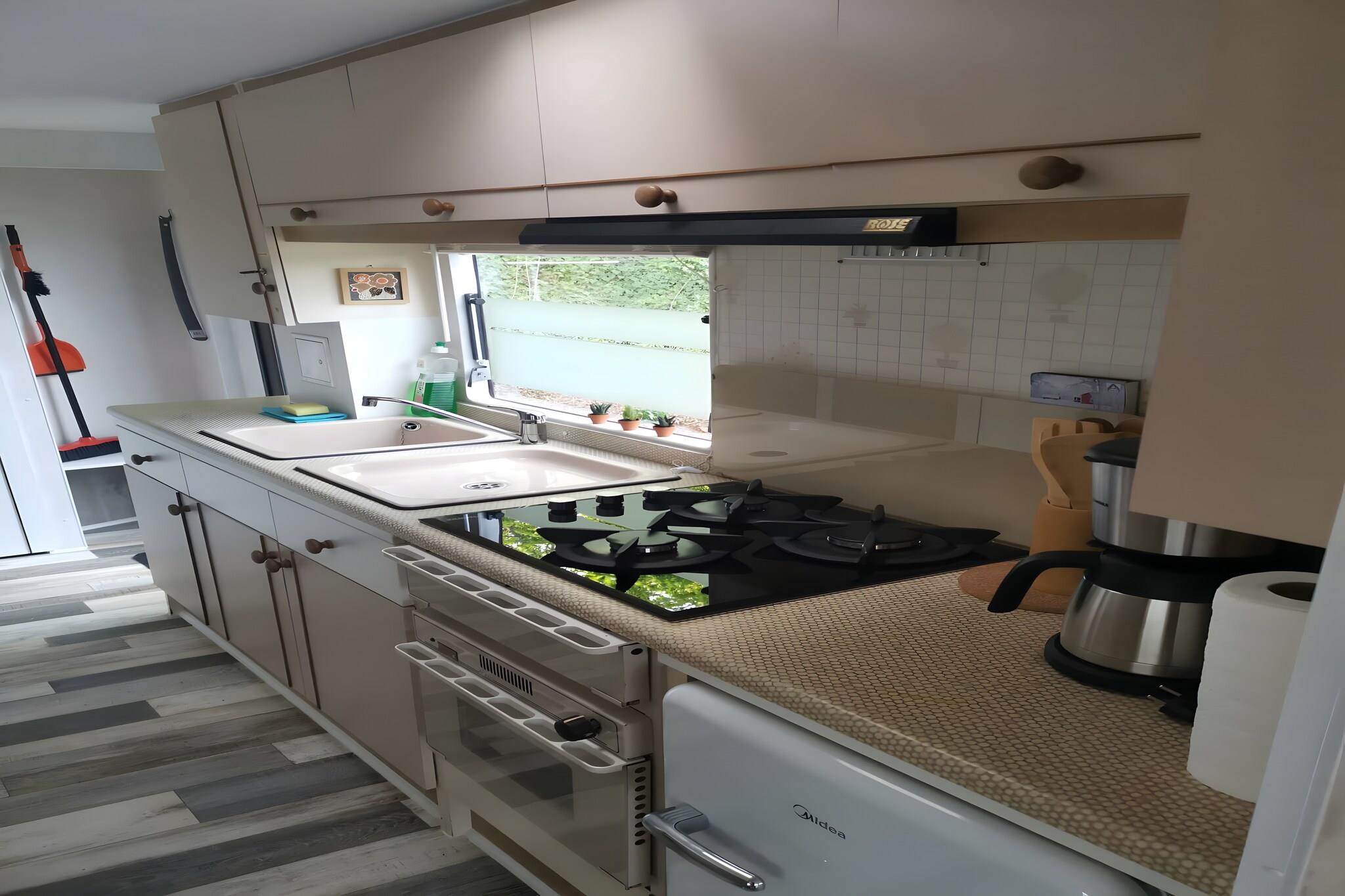 Stueetage: (Stue(Fjernsyn(parabol), sofahjørne), køkken-alrum(spisebord, elkedel, komfur(gas), kaffemaskine, køleskab), soveværelse(dobbeltseng), soveværelse(enkeltseng, enkeltseng), badeværelse(bruser, håndvask, toilet, føntørrer), terrasse, barneseng) vaskemaskine(betalt), have, havemøbler, grill, parkering