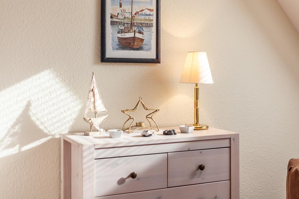 Im Wohn- und Schlafbereich kann das bequeme Boxspringbett (2 getrennte Matratzen, aber mit durchgängigem Topper von 180x200) mit vielen Kissen natürlich auch als Fernsehcoach benutzt werden. In dem kleinen Kleiderschrank lassen sich genug Kleidungsstücke für 2-3 Personen verstauen. Der Sessel ist zum Bett ausziehbar und steht etwas separat unter einem Fenster und ist auch gut als Lesesessel nach einem erschöpfenden Strandtag zu benutzen. Eine Leselampe steht auf der Kommode daneben.