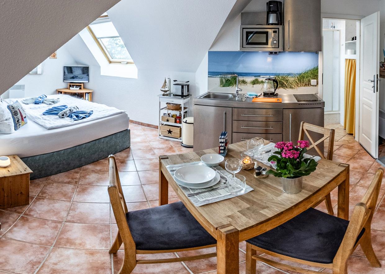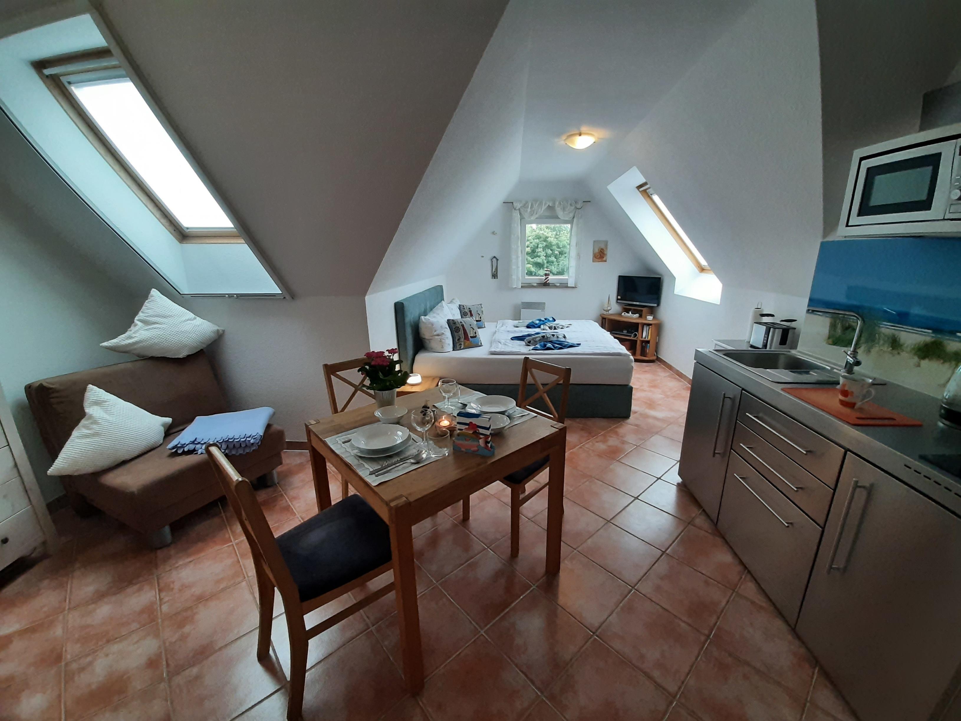 Die 1-Zimmer-Ferienwohnung für 2-3 Personen ist sehr hell und geräumig. In allen Räumen sind Bodenfliesen verlegt. Sämtliche Dachfenster sind mit wirksamen Sonnenschutz- und Verdunkelungsrollos ausgestattet. Fewo Ostsee-Schwänchen I und II können auch zusammen gemietet werden! Ideal für Familienurlaub mit Teenagern!
