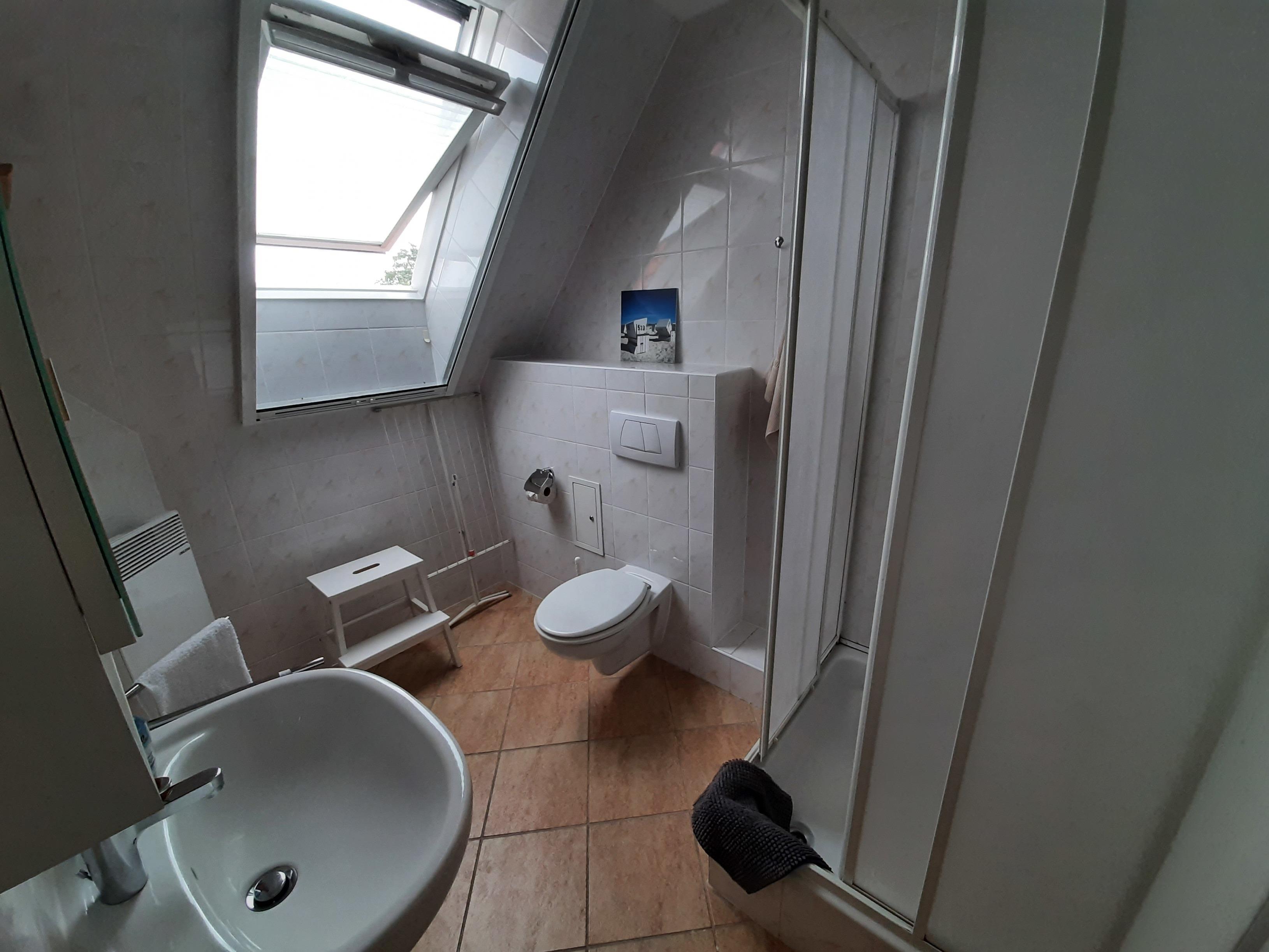 Das Bad mit Dusche und WC ist etwas größer und verfügt über ein Fenster. Der Wäscheständer für die Strandhandtücher kann hier bequem aufgestellt werden.