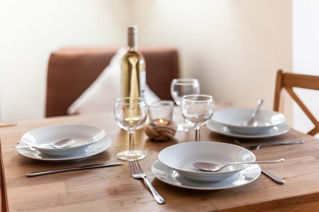 Der Essbereich besteht aus einem Tisch mit 3 Stühlen, an dem sich auch gut Gesellschaftsspiele machen lassen. Eine Holzspielesammlung steht unter dem Fernseher im Regal.
