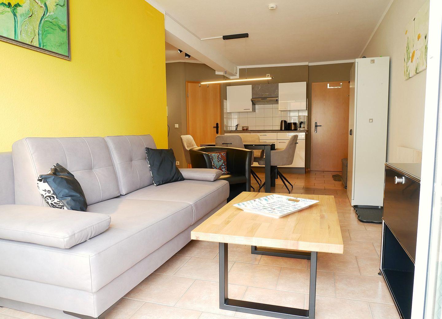 Das offen gestaltete Wohnzimmer mit kombiniertem Essbereich ist gut ausgestattet. Zur Ausstattung gehören ein Sofa, dass zu einem komfortablem Schlafsofa (155x200cm) mit durchgehender Matratze umfunktioniert werden kann, ein TV-Gerät, Radio, CD-Player, Blu-Ray-Player und Esstisch. Die Küche ist ebenfalls in den Raum integriert und bietet neben einer Mikrowelle mit Backofenfunktion, Kühlschrank mit Gefrierfach, einem Induktionsherd auch diverse Kleingeräte, wie Kaffeemaschine, Toaster, Wasserkocher, Mixer und verschiedene Küchenutensilien.