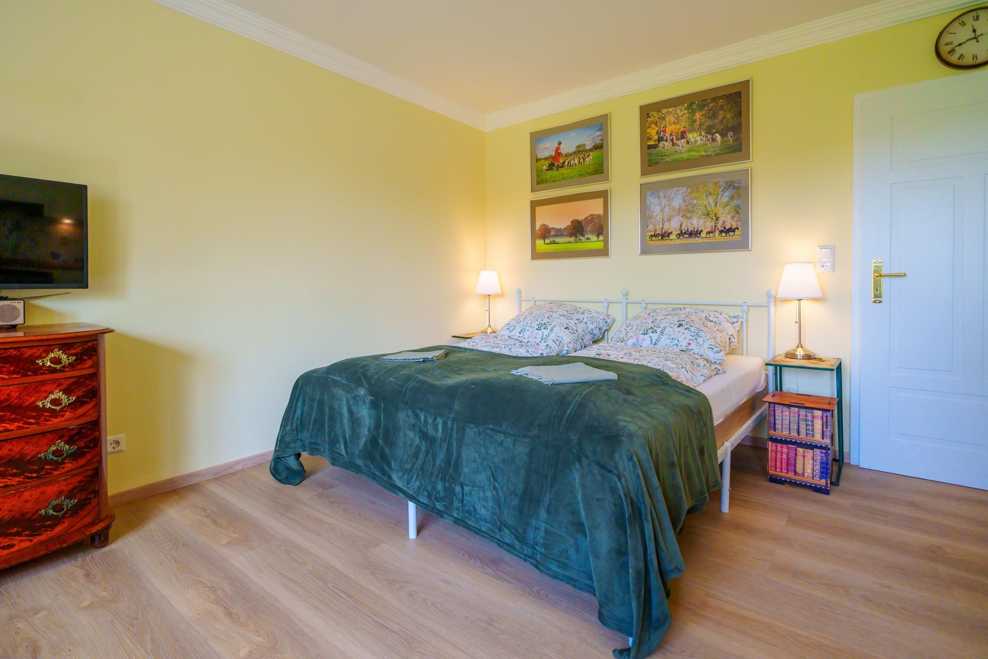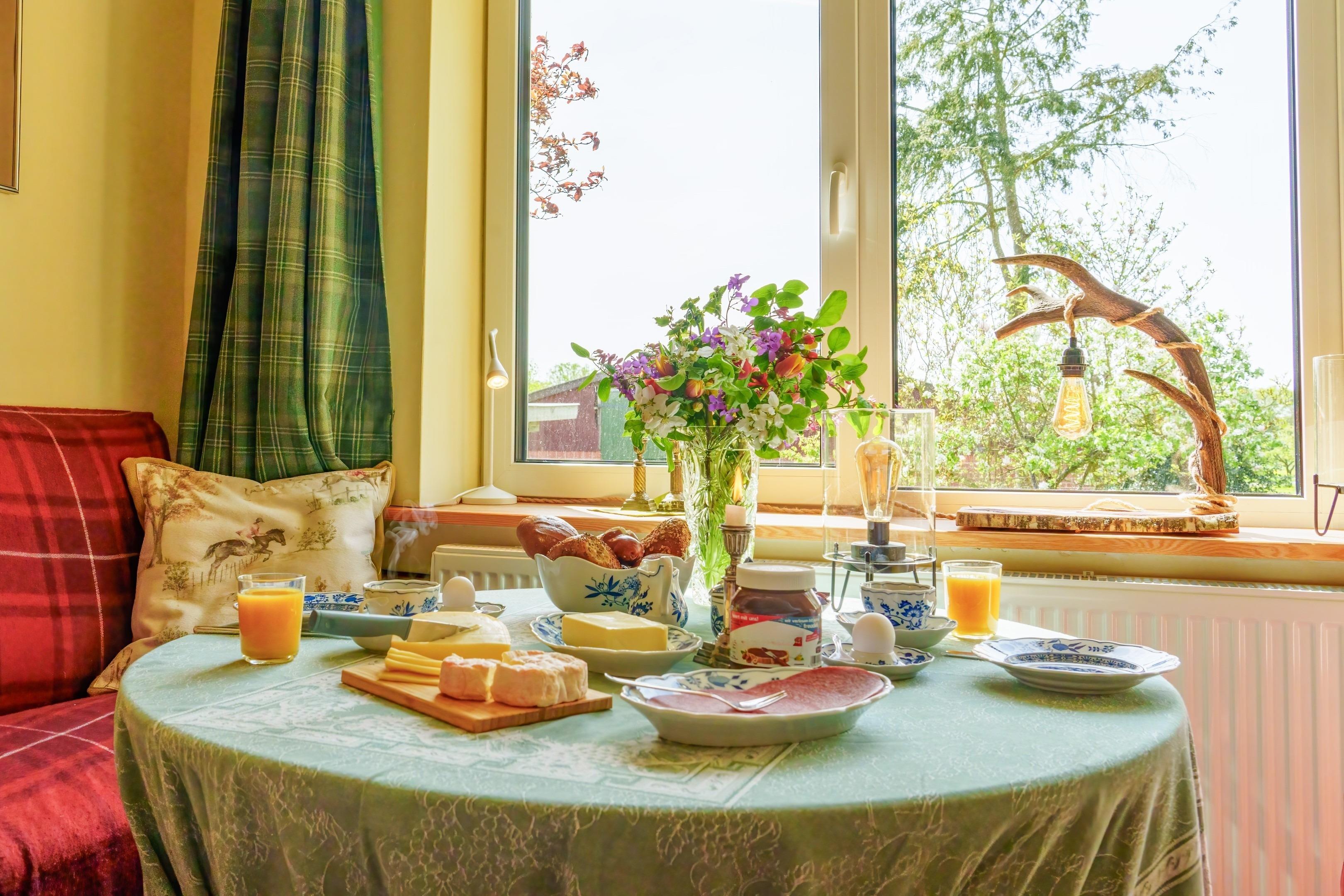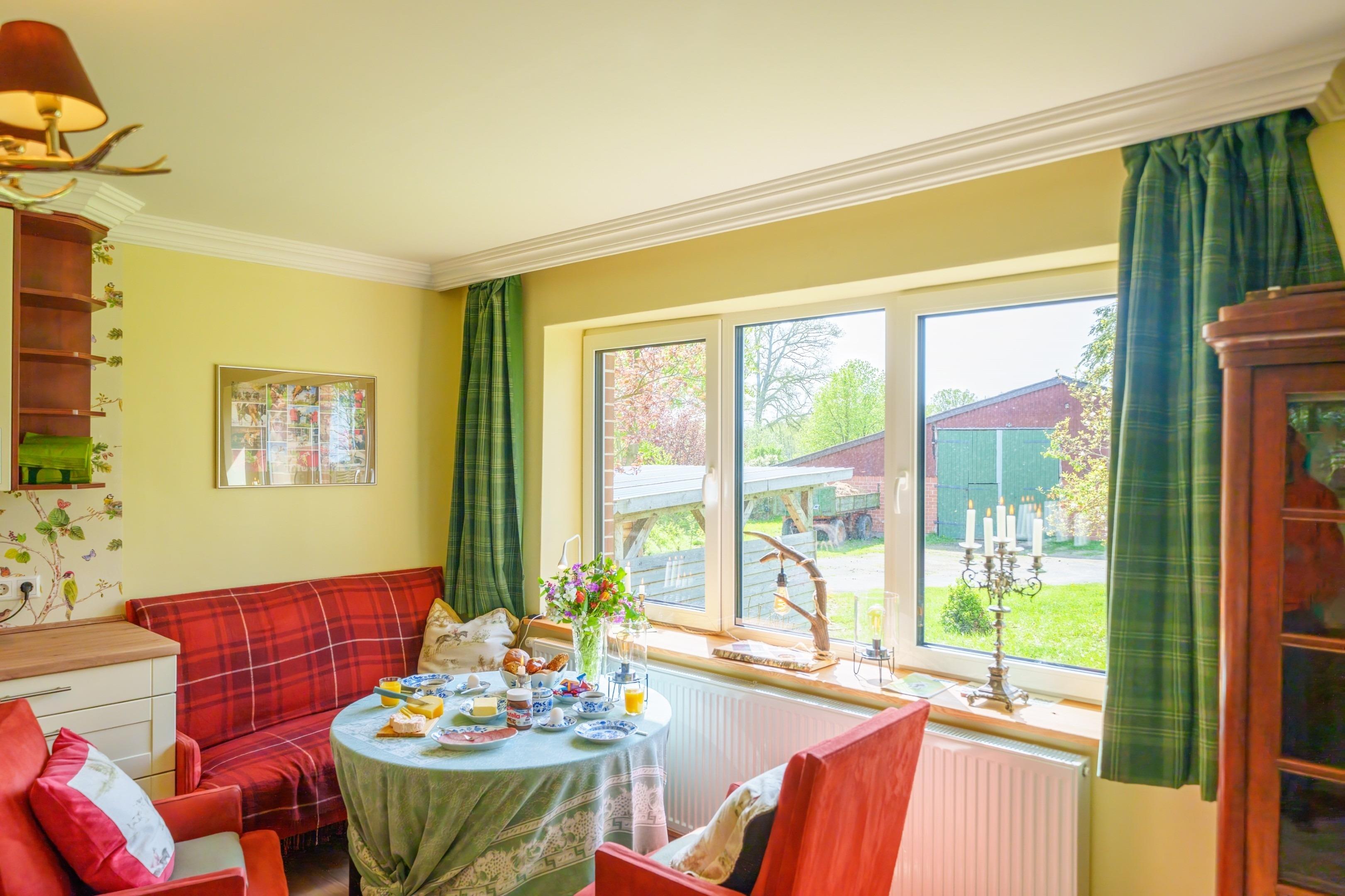 Aus dem Wohnzimmer blicken Sie ganz entspannt ins Grüne. Mit viel Liebe zum Detail wurde hier auf 35 qm ein Urlaubsparadies für Pärchen, Wanderer, Reiter, Jäger und Naturbegeisterte geschaffen.