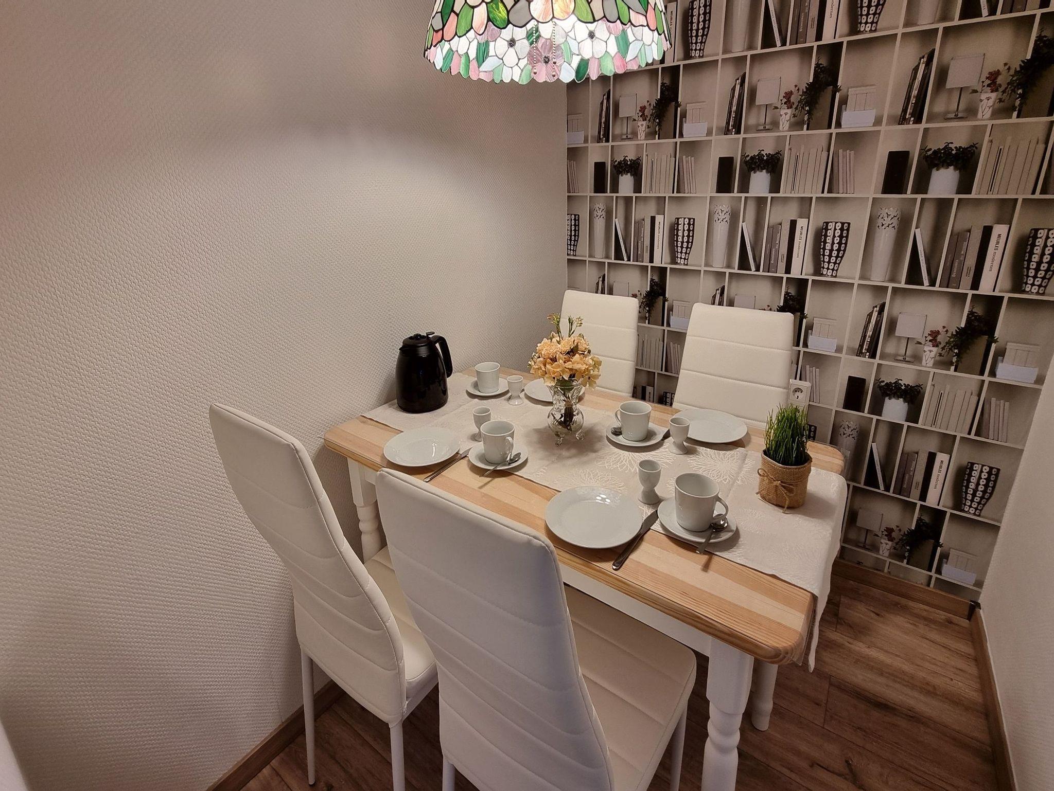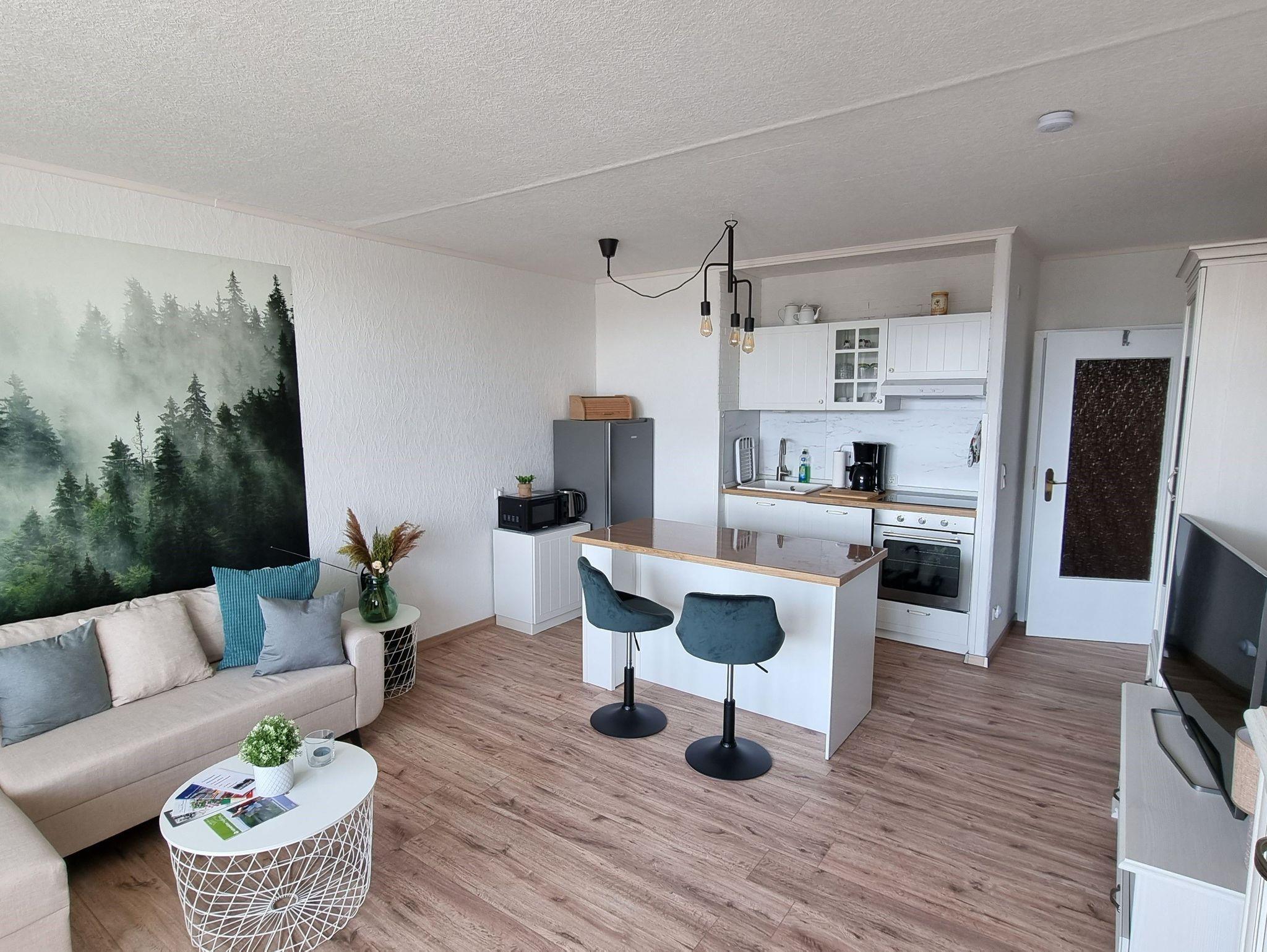 Die 4-Raum-Ferienwohnung Kiefernblick mit einer Größe von 59 m² befindet sich im Haus 2 in der 5. Etage. 2023 wurde die Ferienwohnung renoviert, sie verfügt über WLAN und wird ganzjährig für max. 4 Personen vermietet. Mit einem gemütlichen Ambiente und einem großen Balkon lädt die Ferienwohnung Kiefernblick zum Wohlfühlen ein. Auf dem Balkon lässt sich die Morgensonne mit einem unverbauten Blick zum Bocksberg genießen. Ein Fahrstuhl bringt unsere Gäste bequem in die 5. Etage.
