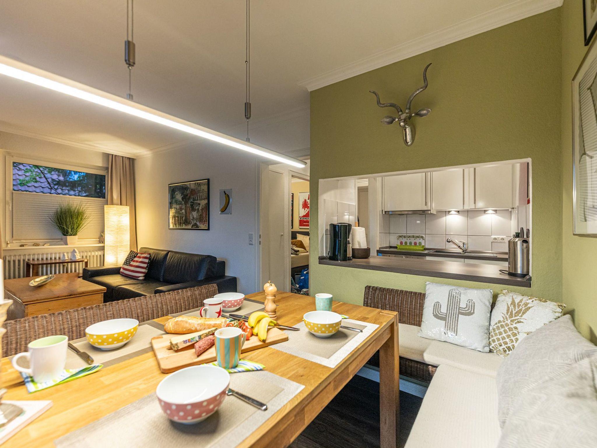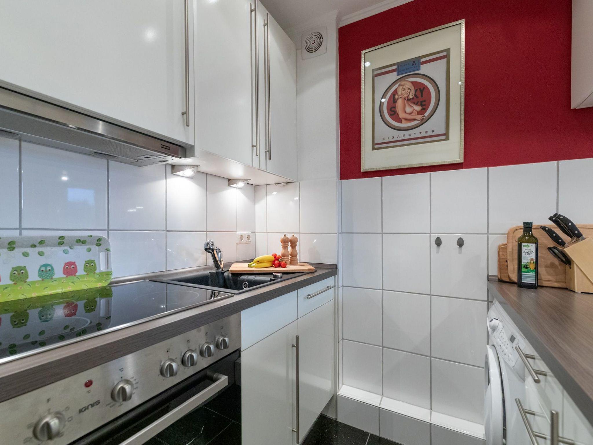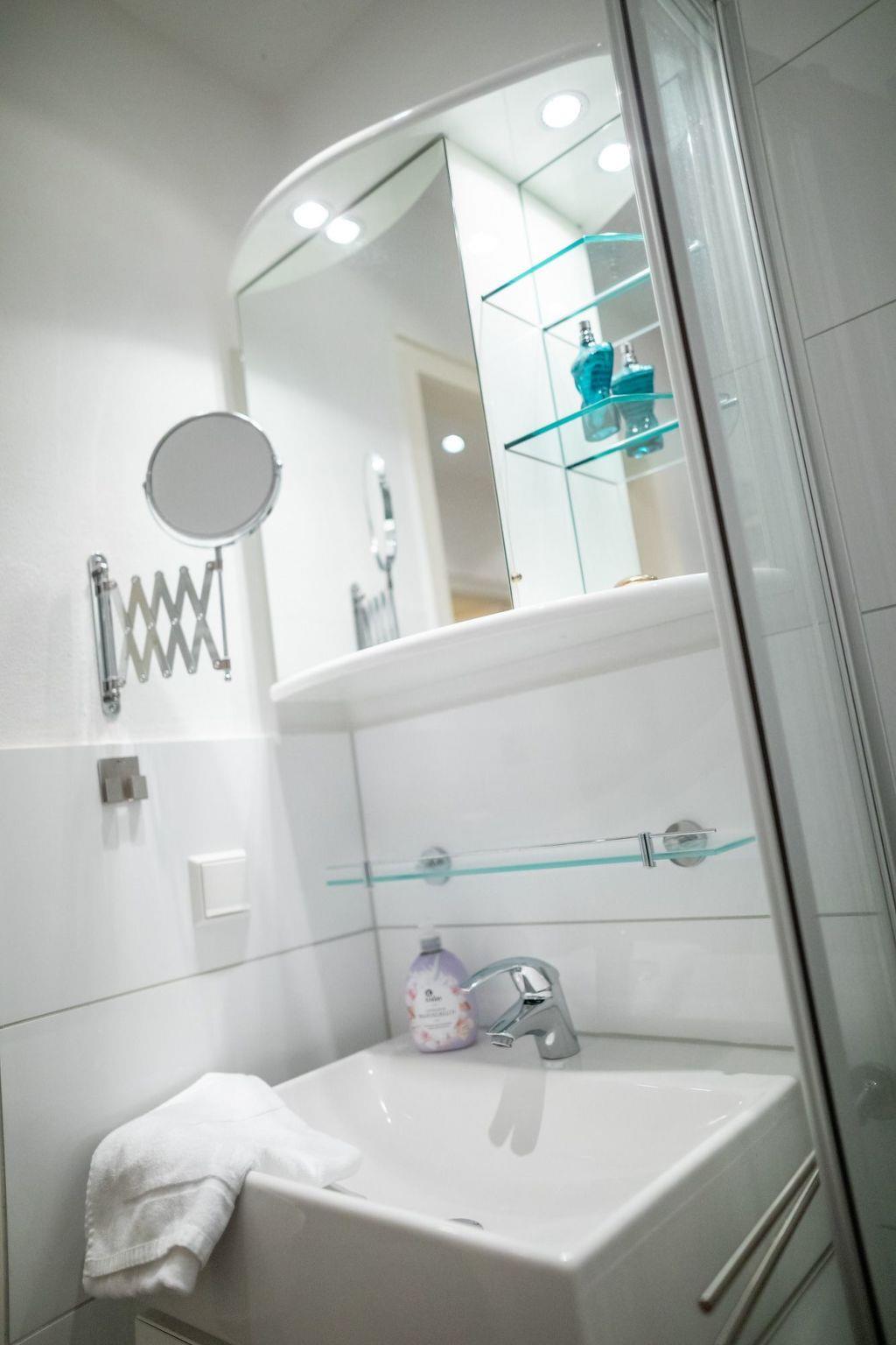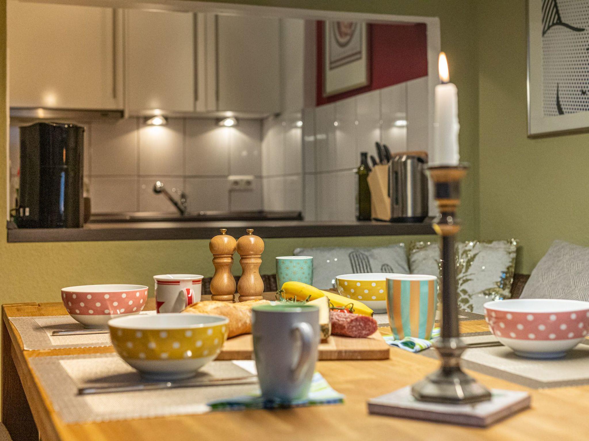 The open-plan kitchen is equipped with all kitchen appliances and while cooking you have a beautiful view of the Kranichsee lake from the counter. There is also a washing machine in the kitchen.